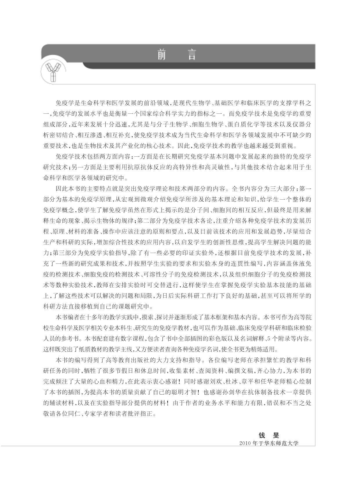 本书主要分为三部分:免疫学基本理论、免疫学基本技术以及免疫学实验指导。免疫学基本理论部分主要从整体、细胞和分子三个层面介绍了免疫学的基本概念和重要理论,包括免疫系统的构成,固有免疫与适应性免疫的应答过程和辨证关系,免疫应答中的调节机制和免疫病理的基本知识,以及免疫分子尤其是抗原、抗体的特征与相互关系,为后面介绍免疫学技术打下理论的基础。免疫学基本技术部分重点介绍目前生命科学和医学领域常用的有关免疫学技术,了解其基本操作原理、程序和应用范围,以及各技术的优缺点;学会应用免疫学技术来设计研究课题和解决实际问题。该部分内容包括:抗体制备技术、经典免疫学技术、免疫标记技术、机体免疫功能的检测技术以及免疫组织化学技术。 免疫学实验指导部分供开设免疫学实验课程使用。该部分单独装订成册附于书后,以方便使用。 本书可作为高等院校生物学及医学相关专业本科生、研究生的免疫学教材,也可以作为基础、临床免疫学科研和临床检验人员的参考书。 |