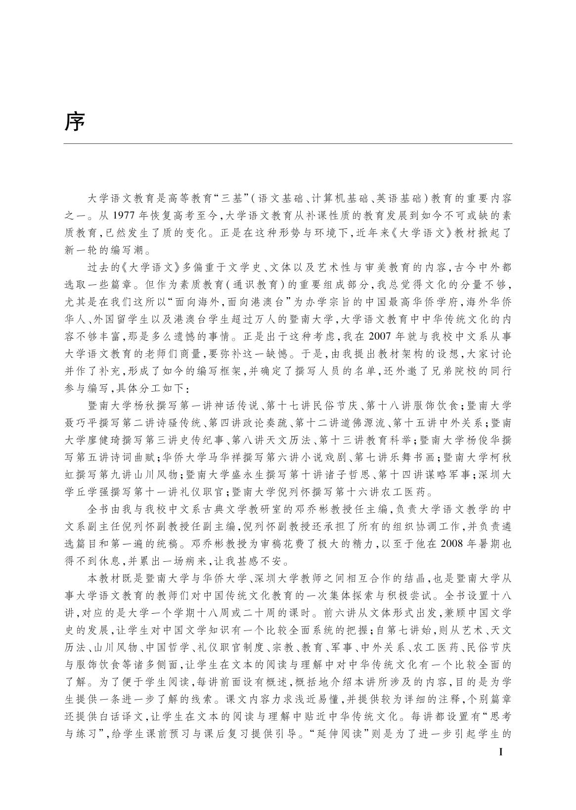 本书的主要特点是:在总体设计思想方面,试图使学生通过学习既提高语文素质,又对中华文化有进一步的认识;在内容的基本构成方面,以中国传统文化为纲,设计了从“神话传说”到“服饰饮食”等十八个专题,基本覆盖了中国古代从思想文化到制度文化、物质文化的各个门类和层面,以之构成本教材的基本框架;在选文方面,既选择了同类教材通常所收的诗词曲赋、小说戏剧等文学作品,也包括了反映传统哲学、宗教、科技、教育、军事、医药、民俗、日常生活等方面内容的可读性较强的课文。因此,本书除了适合学生使用外,也可作为中华传统文化教育的读本,尤其是对于对中华文化了解不多的海外华侨华人青少年、港澳台地区青少年,本书可作为他们初步了解中华文化的入门读物。 |