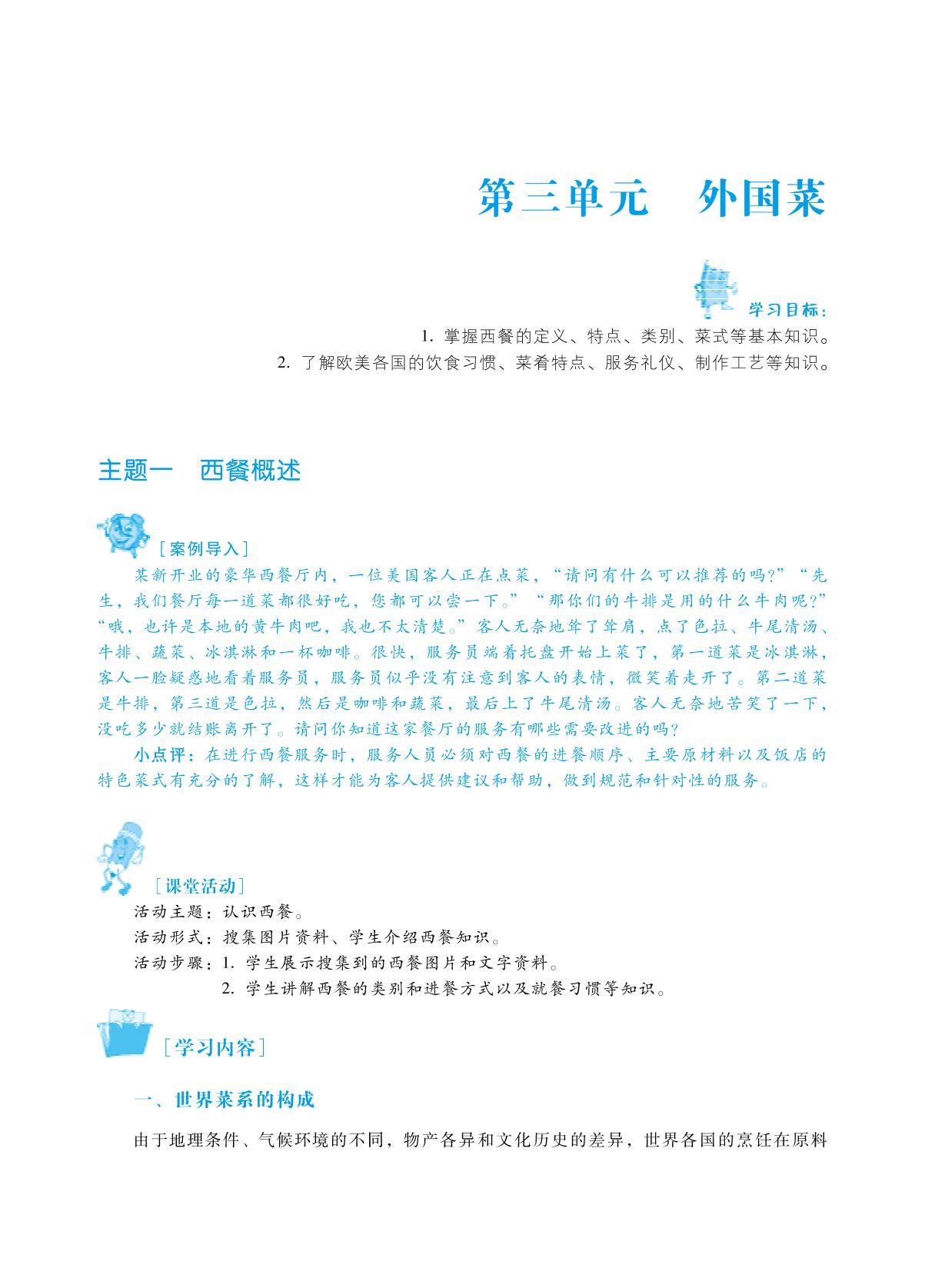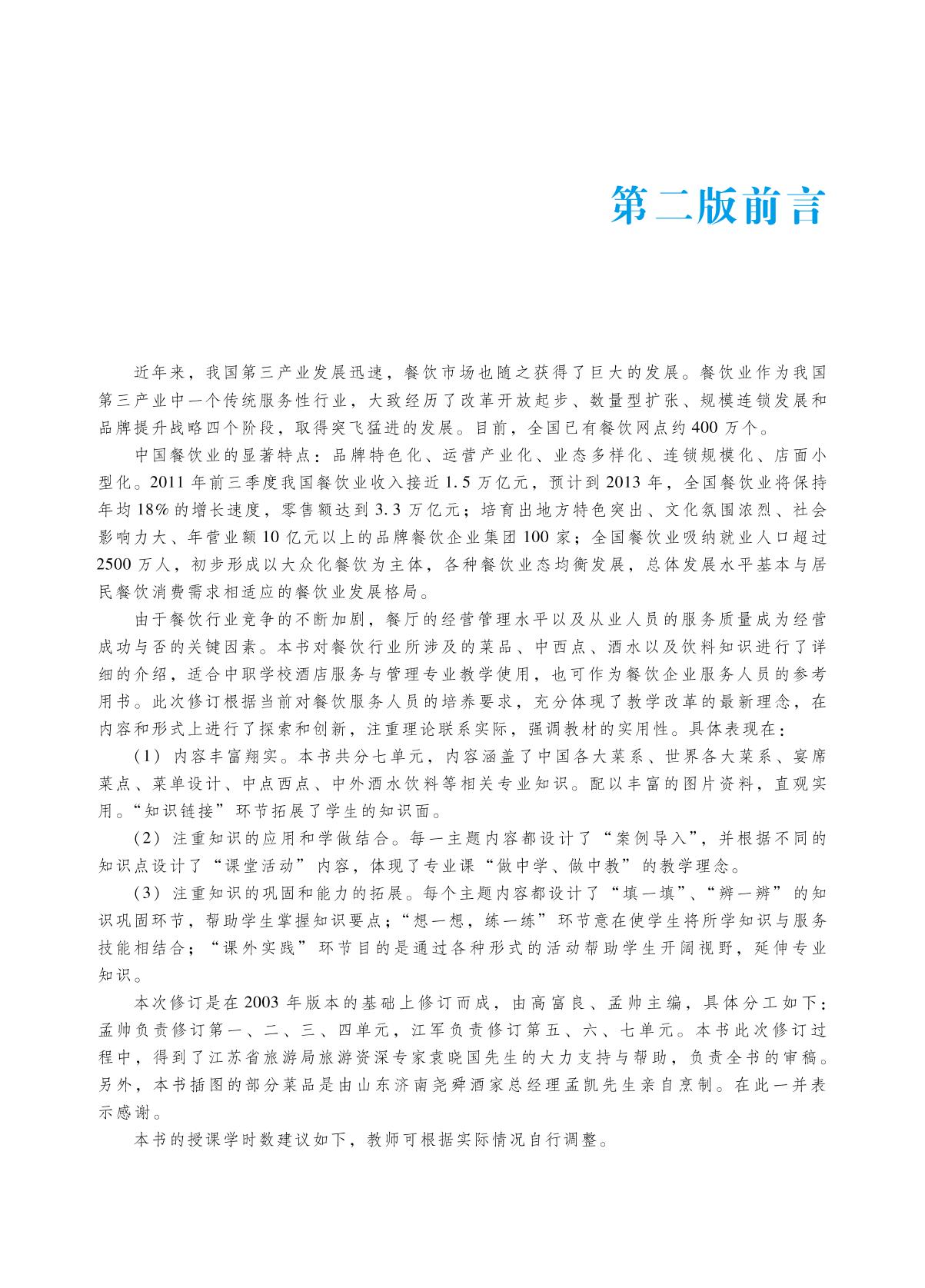 本书为中等职业教育酒店服务与管理专业国家规划教材配套教学用书。 本书是在2003年版本的基础上修订而成,全书共分为七个单元,主要内容包括:中国菜、菜单、外国菜、中点和西点、中国酒、外国酒、常见软饮料等。每个单元主题都设计了“案例导入”和“课堂活动”环节,主题后设计了题型丰富的“自我检测”环节,体现了“做中学、做中教”的课改理念;“知识链接”环节有助于拓展学生的知识面。 本书内容丰富,图文并茂,语言通俗易懂,实用性强。 本书适用于中等职业学校酒店服务与管理专业教学使用,也可作为餐饮企业服务人员的参考用书。 本书配套学习卡资源,按照本书最后一页“郑重声明”下方的学习卡使用说明,登录“http://abook.hep.com.cn/sve,可上网学习,下载资源。 |