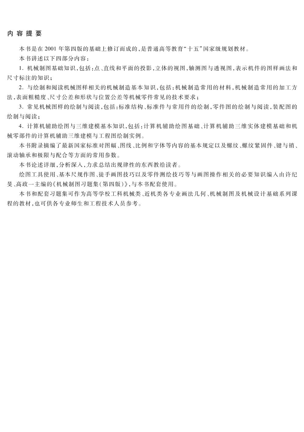 本书是在2001年第四版的基础上修订而成的,是普通高等教育“十五”国家级规划教材? 本书讲述以下四部分内容: 1. 机械制图基础知识,包括:点?直线和平面的投影,立体的视图,轴测图与透视图,表示机件的图样画法和尺寸标注的知识; 2. 与绘制和阅读机械图样相关的机械制造基本知识,包括:机械制造常用的材料,机械制造常用的加工方法,表面粗糙度?尺寸公差和形状与位置公差等机械零件常见的技术要求; 3. 常见机械图样的绘制与阅读,包括:标准结构?标准件与常用件的绘制,零件图的绘制与阅读,装配图的绘制与阅读; 4. 计算机辅助绘图与三维建模基本知识,包括:计算机辅助绘图基础?计算机辅助三维实体建模基础和机械零部件的计算机辅助三维建模与工程图绘制实例? 本书附录摘编了最新国家标准对图幅?图线?比例和字体等内容的基本规定以及螺纹?螺纹紧固件?键与销?滚动轴承和极限与配合等方面的常用参数? 本书论述详细,分析深入,力求总结出规律性的东西教给读者? 绘图工具使用?基本尺规作图?徒手画图技巧以及零件测绘技巧等与画图操作相关的必要知识编入由许纪旻?高政一主编的《机械制图习题集(第四版)》,与本书配套使用? 本书和配套习题集可作为高等学校工科机械类?近机类各专业画法几何?机械制图及机械设计基础系列课程的教材,也可供各专业师生和工程技术人员参考? |