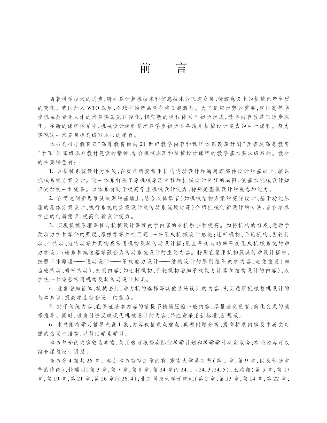 本书是教育部“高等教育面向21世纪教学内容和课程体系改革计划”的研究成果,是面向21世纪课程教材和普通高等教育“十五”国家级规划教材。为了适应高等学校机械类专业宽口径人才培养和新课程体系改革的需要,特编写本书。本书以机械系统设计为主线,将机械原理课程和机械设计课程的内容进行必要的整合和提高。 本书共4篇26章:第1篇机械设计总论(第1~6章),除介绍机械设计的共性问题外,还简介了现代机械设计思想和方法等内容;第2篇常用机构及其传动设计(第7~14章),主要介绍连杆机构、凸轮机构、齿轮传动、链传动、带传动及其他常用机构的运动设计、工作能力设计计算和结构设计;第3篇通用零部件设计(第15~21章),主要介绍通用连接、轴及轴系零部件、弹簧、箱体及机座等设计;第4篇机械系统设计(第22~26章),重点介绍执行系统的方案设计、传动系统设计、机械系统动力学设计及动力机选择等内容。每章后附有思考题或习题。书末附有学习辅导光盘1张,以利读者学习。 本书主要作为高等学校工科机械类专业机械原理课程和机械设计课程的教材,可以合并授课,亦可分别开课,同时也可供有关工程技术人员参考。 |