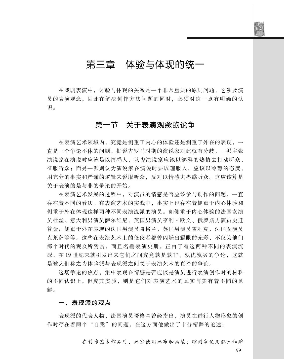 本书在总结目前国内艺术院校表演专业教学经验,研究我国戏剧表演创作实践,吸收国外表演教学可资借鉴的观念的基础上,系统地阐述表演专业方面的基础知识和表演艺术创作的基本方法。 本书编排了大量的练习,使表演教学在思想、生活、技巧三方面有机地结合在一起,并且注重生活观察、创作素质与创作方法的联系,方便学生系统、科学地学习,同时也方便老师的教学,具有较强的实践性和指导意义。 本书可供高等艺术院校本、专科表演专业和同等学力使用,也可供表演艺术爱好者自学使用。 |
