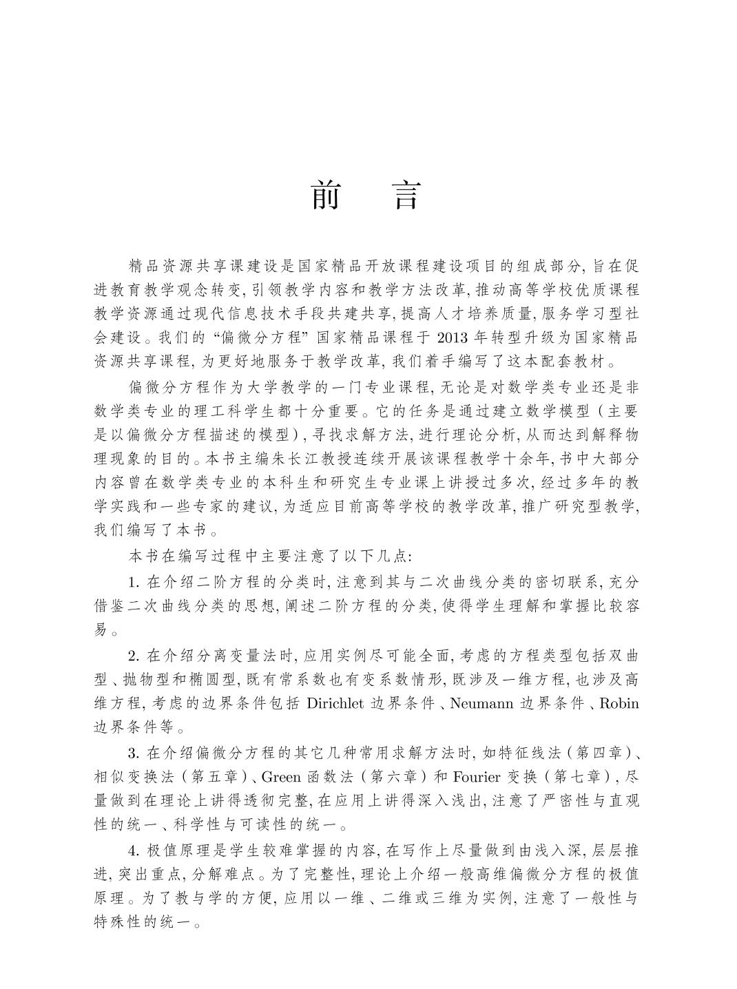 本书是国家精品资源共享课“偏微分方程”的配套教材,是作者基于多年讲授数学类专业“偏微分方程”课程讲义的基础上修改编写而成的。全书重点介绍了偏微分方程的基本理论和方法,共分七章:第一章介绍偏微分方程的基本概念和几个经典方程及定解问题的物理与力学来源;第二章介绍二阶方程的特征理论及方程的分类;第三章介绍分离变量法;第四、五、六章分别讨论双曲型、抛物型和椭圆型方程定解问题的求解方法、理论分析、适定性等, 并利用所获得的解对物理现象及力学规律加以解释;第七章介绍Fourier 变换及其应用。各章内容相对独立,自成体系, 教学时可根据实际教学时数任选其中几章独立安排教学。 本书力求做到由浅入深,通俗易懂,便于教师教学和学生学习。可作为高等学校数学类专业本科生“偏微分方程”“数学物理方程”课程的教材或教学参考书,也可作为理工类本科生或研究生“数学物理方程”“数学物理方法”课程的教材或参考书。 |