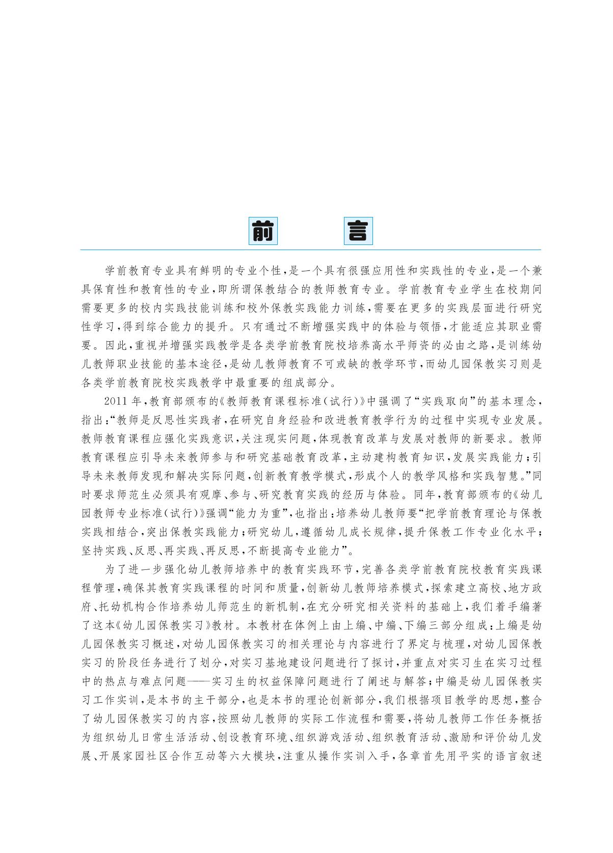 本书是“十二五”职业教育国家规划教材。 本书分三编十二章。上编为幼儿园保教实习概述,内容包括:幼儿园保教实习基础理论、幼儿园保教实习的内容、幼儿园保教实习的组织与管理过程、幼儿园实习基地的建设与实习生的权益保障。中编为幼儿园保教实习实训,内容包括:幼儿日常生活活动组织模块、幼儿园环境美化创设模块、幼儿游戏的组织模块、幼儿教育活动的组织模块、激励与评价幼儿发展模块,以及幼儿园与家庭、社区互动模块。下编为幼儿园保教实习的评价与反思,内容包括幼儿园保教实习的评价、幼儿园保教实习的反思。 本书可作为高职高专院校、五年制高专、本科院校举办的职业技术学院、成人教育、应用型本科学前教育专业的教材,也适用于中职相关专业,并可作为社会从业人士的业务参考书及培训用书。 |