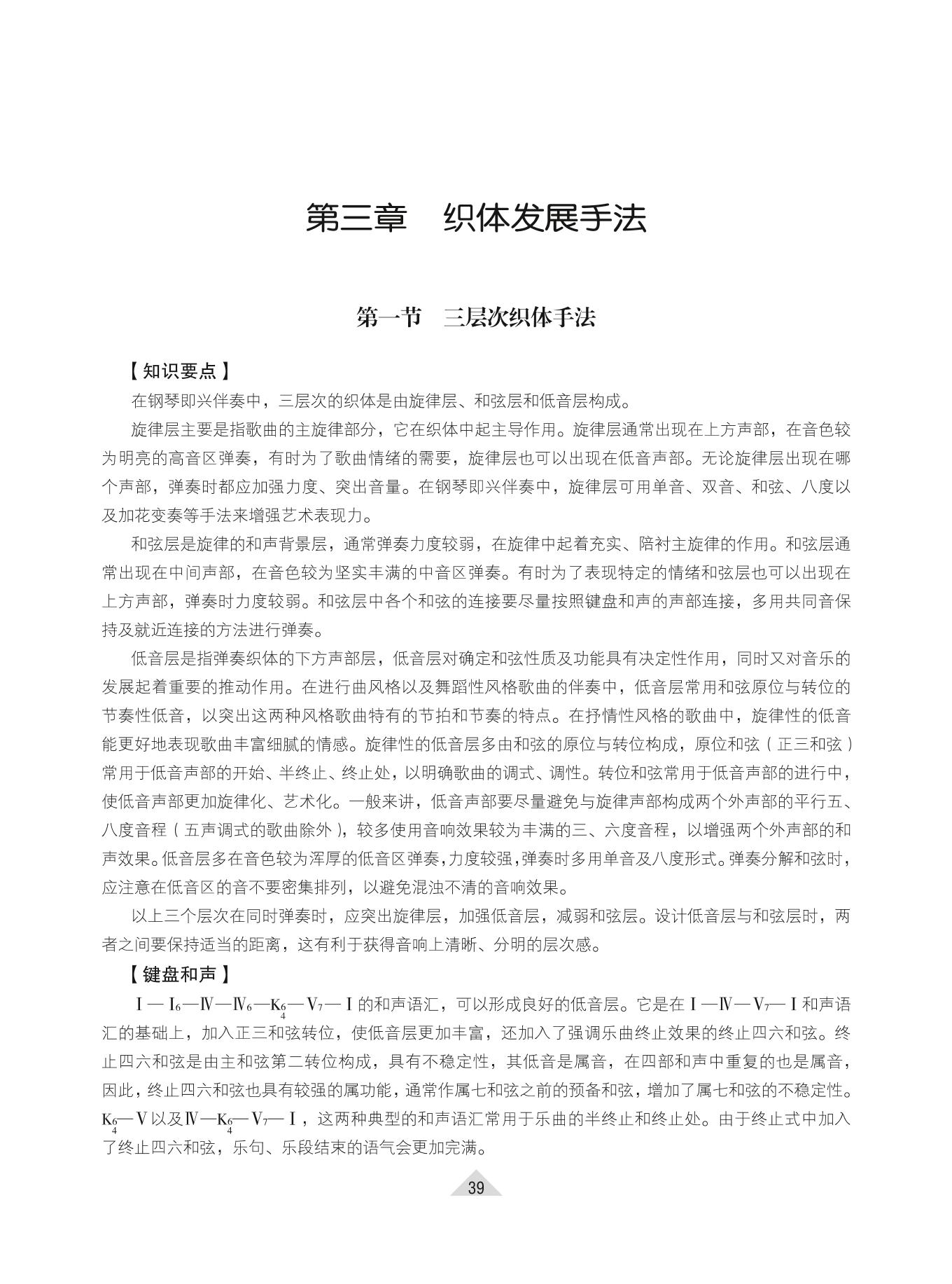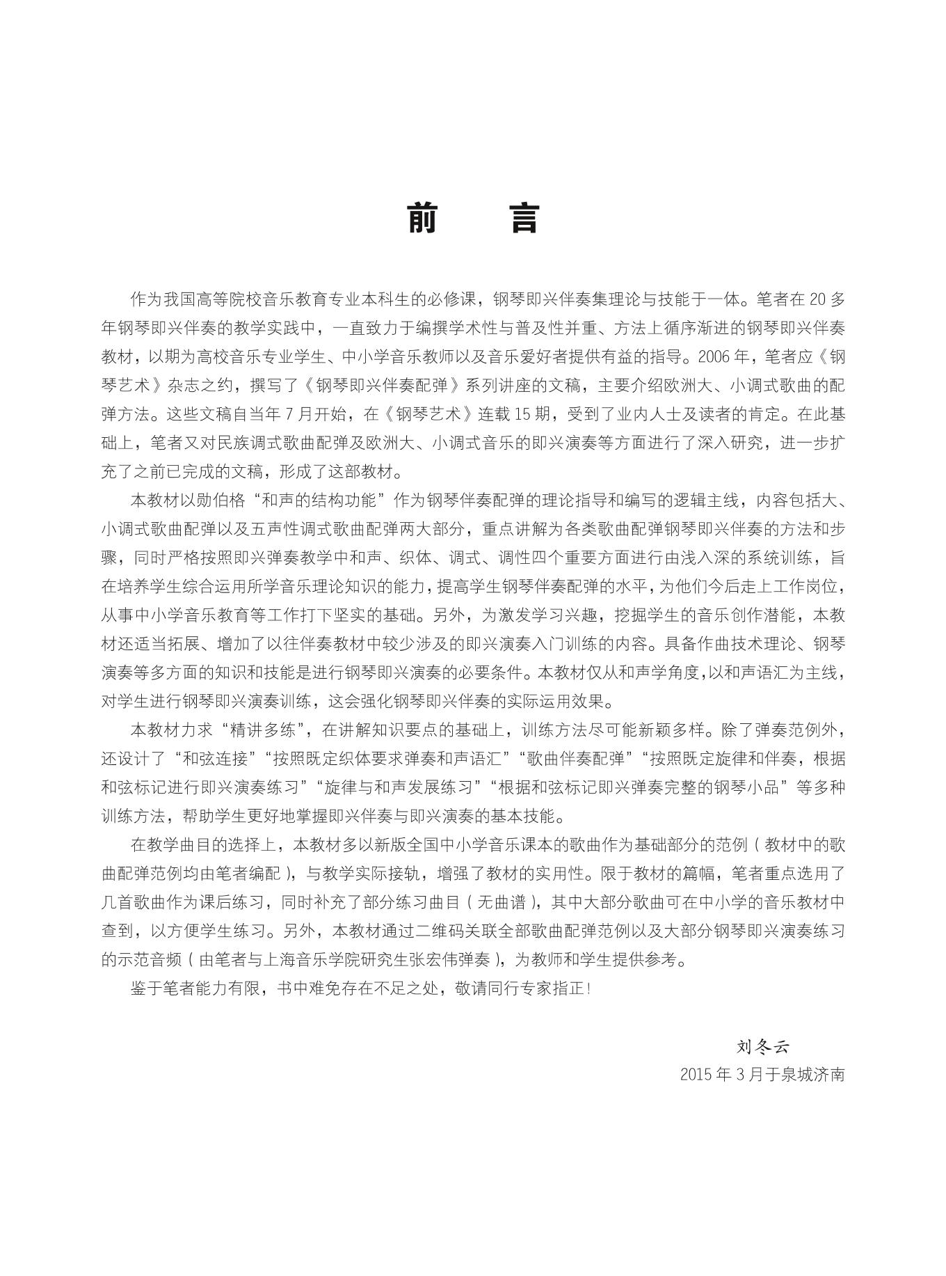 本书是为高等学校音乐学(音乐教育)专业基础课程———“钢琴即兴伴奏”编写的教材。内容包括大、小调式歌曲配弹与五声性调式歌曲配弹两大部分,共十一章。本书按照“精讲多练”及“训练方法多样化”的原则,在讲解钢琴即兴伴奏理论知识的基础上,重点指导学生进行系统的键盘和声、歌曲即兴伴奏、钢琴即兴演奏的训练。同时,本书注重教学曲目的选择,多选用最新出版的全国中小学音乐课本的歌曲作为基础部分的范例,增加教材的实用性,力求与中小学教学内容接轨。 本书适用于高等学校音乐专业本、专科学生,也可以作为中小学音乐教师、广大钢琴伴奏和即兴弹唱爱好者的参考用书。 |