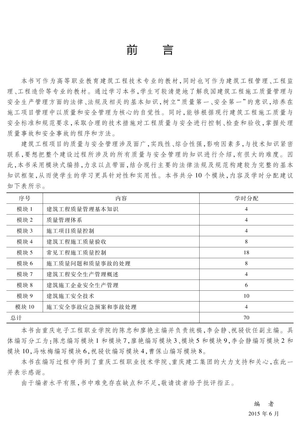 本书依据新的标准、规范,结合技术技能型人才培养的特点,以岗位核心职业能力构建课程内容体系。全书共分为10个模块,包括建筑工程质量管理基本知识、质量管理体系、施工项目质量控制、建筑工程施工质量验收、常见工程施工质量控制、施工质量问题和质量事故的处理、建筑工程安全生产管理概述、建筑施工企业安全生产管理、建筑施工安全技术、施工安全事故应急预案和事故处理。