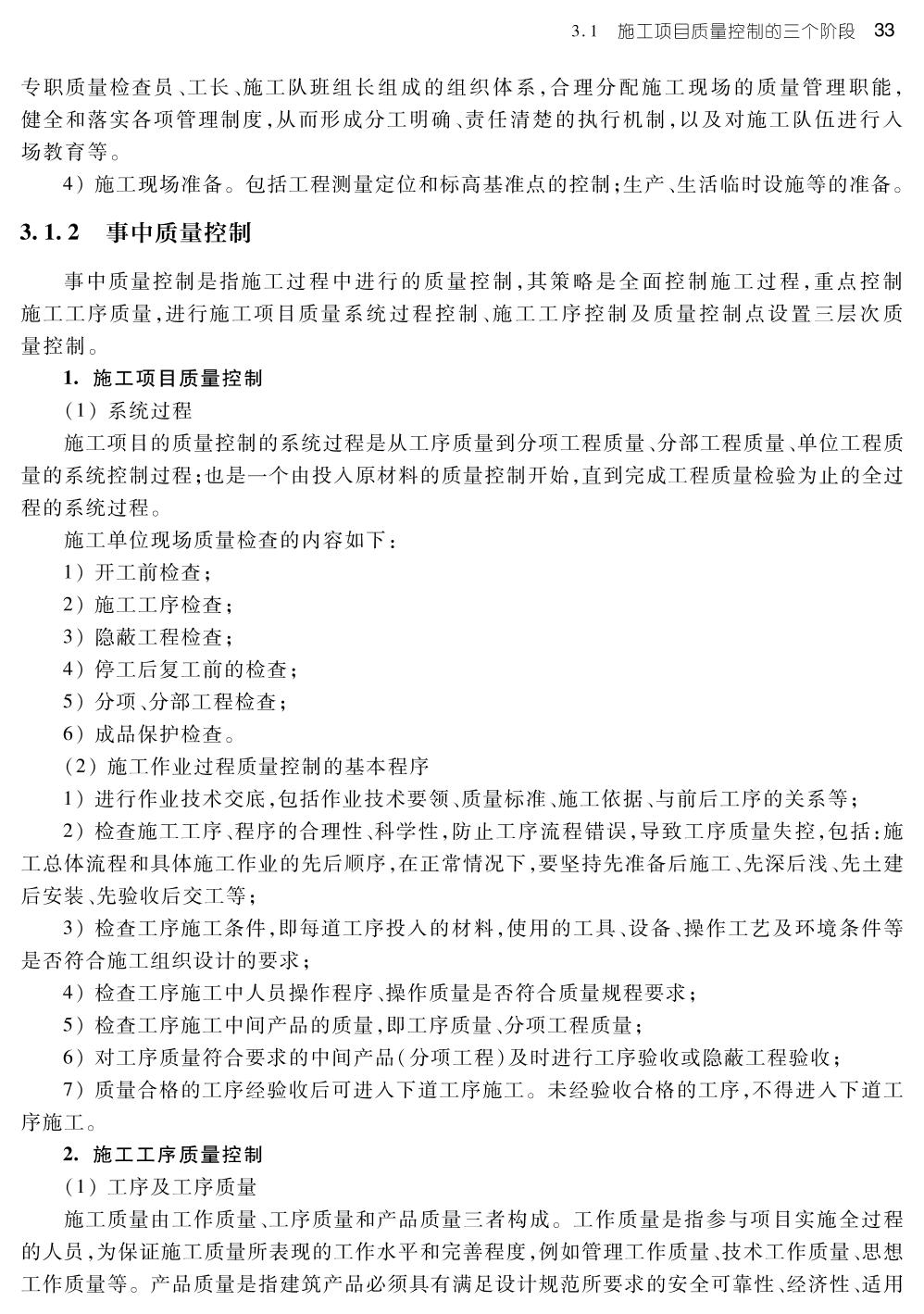 前言 模块1 建筑工程质量管理基本知识 1.1 质量管理概述 1.1.1 质量与质量管理 1.1.2 质量管理的发展过程 1.1.3 全面质量管理理论 1.2 建筑工程质量管理 1.2.1 建筑工程质量 1.2.2 建筑工程质量的特点 1.2.3 影响工程质量的因素 1.2.4 工程建设各阶段对质量形成的影响 1.3 建设工程各质量主体的质量责任和义务 1.3.1 建设单位的质量责任和义务 1.3.2 勘察、设计单位的质量责任和义务 1.3.3 施工单位的质量责任和义务 1.3.4 工程监理单位的质量责任和义务 1.4 建设工程质量管理法律法规体系 1.4.1 建设工程法律法规体系 1.4.2 主要的法律法规 1.5 建设工程质量管理制度 1.5.1 施工图设计文件审查制度 1.5.2 工程质量监督制度 1.5.3 工程质量检测制度 1.5.4 工程质量保修制度 拓展与实训 模块2 质量管理体系 2.1 质量管理体系与ISO 9000族标准 2.1.1 质量管理体系 2.1.2 ISO 9000族标准简介 2.1.3 我国质量管理标准的演变 2.1.4 建筑工程领域贯彻ISO 9000族标准概况 2.2 质量管理的八项原则 2.2.1 以顾客为关注焦点 2.2.2 领导作用 2.2.3 全员参与 2.2.4 过程方法 2.2.5 管理的系统方法 2.2.6 持续改进 2.2.7 基于事实的决策方法 2.2.8 互利的供方关系 2.3 质量管理体系文件的构成及质量管理体系的建立和运行 2.3.1 质量管理体系文件的构成 2.3.2 质量管理体系的建立和运行 2.4 质量认证 2.4.1 产品质量认证 2.4.2 质量管理体系认证 拓展与实训 模块3 施工项目质量控制 3.1 施工项目质量控制的三个阶段 3.1.1 事前质量控制 3.1.2 事中质量控制 3.1.3 事后质量控制 3.2 施工项目质量控制的五大要素 3.2.1 人的因素控制 3.2.2 材料的控制 3.2.3 机械设备控制 3.2.4 方法的控制 3.2.5 环境因素的控制 3.3 施工项目质量控制的方法和手段 3.3.1 施工质量控制方法 3.3.2 施工项目质量控制手段 拓展与实训 模块4 建筑工程施工质量验收 4.1 概述 4.1.1 建筑工程的质量验收 4.1.2 建筑工程施工质量验收主要依据 4.2 现行施工质量验收标准及配套使用的系列规范 4.2.1 建筑工程施工质量验收系列规范介绍 4.2.2 和《统一标准》配合使用的系列验收规范名称 4.2.3 施工质量验收标准规范的有关术语 4.3 建筑工程施工质量验收的划分 4.3.1 施工质量验收划分的目的 4.3.2 施工质量验收的划分 4.4 建筑工程施工质量控制及验收规定 4.4.1 施工质量验收的基本规定 4.4.2 建筑工程施工质量控制规定 4.4.3 建筑工程施工质量验收要求 4.4.4 建筑工程施工质量验收规定 4.4.5 验收不合格的处理 4.5 建筑工程质量验收程序和组织 4.5.1 检验批及分项工程的验收程序与组织 4.5.2 分部工程的验收程序与组织 4.5.3 单位工程的验收程序和组织 4.6 施工质量验收的资料 4.6.1 工程检验批质量验收记录 4.6.2 分项工程质量验收记录 4.6.3 分部(子分部)工程质量验收记录 4.6.4 单位(子单位)工程质量验收记录 拓展与实训 模块5 常见工程施工质量控制 5.1 地基基础工程质量控制 5.1.1 基本规定 5.1.2 地基质量控制 5.1.3 桩基础质量控制 5.1.4 土方工程质量控制 5.1.5 基坑工程质量控制 5.2 砌体工程质量控制 5.2.1 基本规定 5.2.2 砌筑砂浆的质量控制 5.2.3 砖砌体工程质量控制 5.2.4 配筋砌体工程质量控制 5.2.5 填充墙砌体工程质量控制 5.3 混凝土工程质量控制 5.3.1 基本规定 5.3.2 模板分项工程质量控制 5.3.3 钢筋工程质量控制 5.3.4 混凝土分项工程质量控制 5.3.5 现浇结构分项工程质量控制 5.3.6 混凝土结构子分部工程 拓展与实训 模块6 施工质量问题和质量事故的处理 6.1 工程质量问题的处理 6.1.1 工程质量不合格 6.1.2 工程质量问题的成因 6.1.3 工程质量问题的处理程序 6.2 工程质量事故的特点及分类 6.2.1 工程质量事故的特点 6.2.2 工程质量事故的分类 6.3 工程质量事故处理的依据和程序 6.3.1 工程质量事故处理的依据 6.3.2 工程质量事故处理的程序 6.4 工程质量事故处理方案的确定及鉴定验收 6.4.1 工程质量事故处理方案的确定 6.4.2 选择最适用工程质量事故处理方案的辅助方法 6.4.3 工程质量事故处理的鉴定验收 拓展与实训 模块7 建筑工程安全生产管理概述 7.1 建筑工程安全生产管理基本概念 7.1.1 安全 7.1.2 安全生产 7.1.3 建筑工程安全生产管理 7.2 安全生产管理方针、原则、体制 7.2.1 我国安全生产管理的方针 7.2.2 安全生产管理的原则 7.2.3 安全生产管理体制 7.3 建设工程相关单位的安全责任 7.3.1 建设单位的安全责任 7.3.2 勘察、设计、工程监理及其他有关单位的安全责任 7.3.3 施工单位的安全责任 7.4 建筑工程安全生产管理相关法律法规 7.4.1 安全生产的法律 7.4.2 建筑行政法规 7.4.3 工程建设标准 7.5 建筑工程安全生产管理制度 7.5.1 安全生产责任制 7.5.2 安全技术措施计划制度 7.5.3 安全生产教育制度 7.5.4 安全生产检查制度 7.5.5 伤亡事故和职业病统计报告制度 7.5.6 劳动安全卫生监察制度 7.5.7 “三同时”制度 7.5.8 安全预评价制度 拓展与实训 模块8 建筑施工企业安全生产管理 8.1 建筑工程项目安全管理概述 8.1.1 建筑业安全事故频发的原因 8.1.2 建筑安全事故主要类型 8.1.3 建筑工程安全管理常用术语 8.1.4 施工企业安全管理的基本规定 8.2 安全生产管理责任制 8.2.1 企业主要人员的安全职责 8.2.2 企业主要职能部门的安全职责 8.2.3 项目部安全生产责任制 8.3 安全教育与培训 8.3.1 安全教育的内容 8.3.2 新员工三级安全教育 8.3.3 特种作业人员的培训 8.4 安全检查 8.4.1 安全
