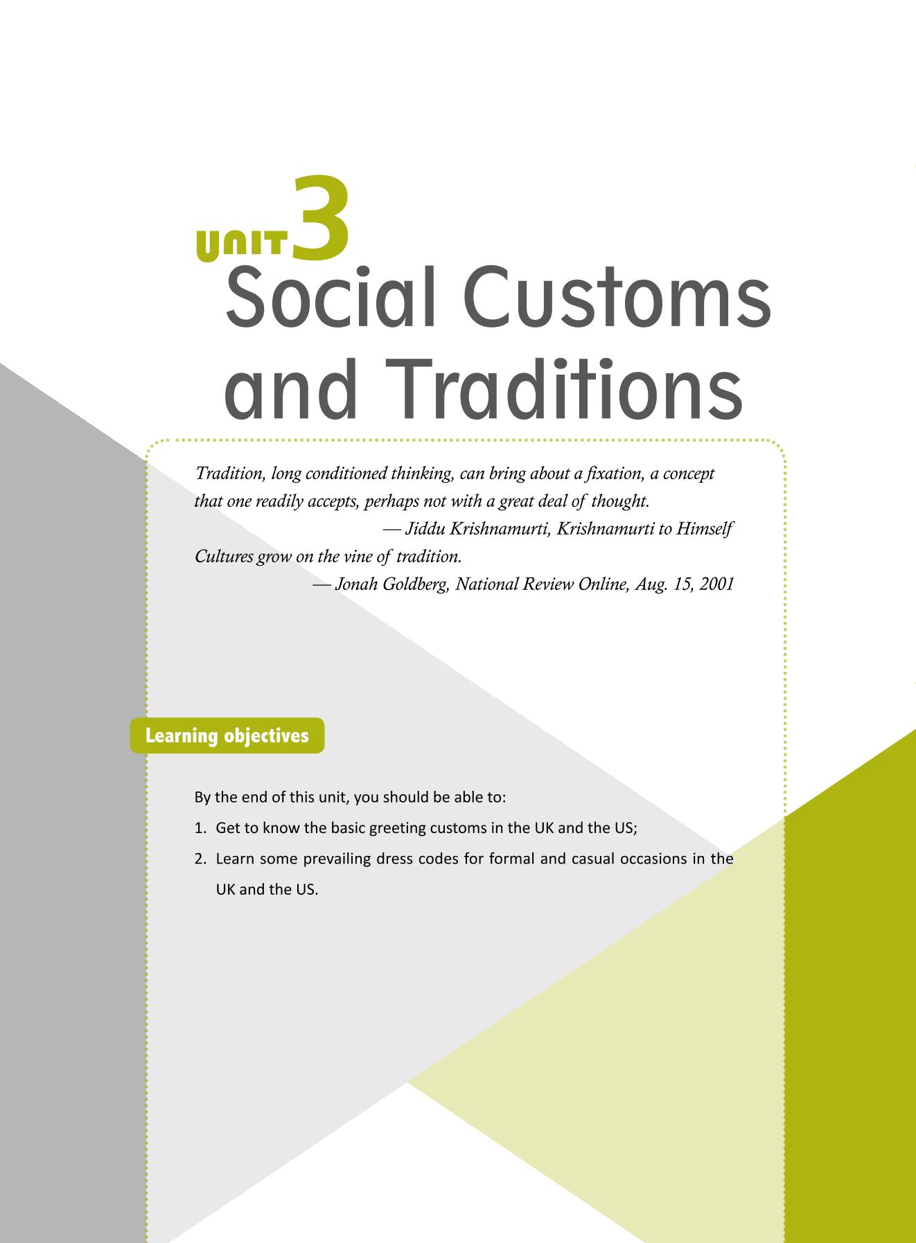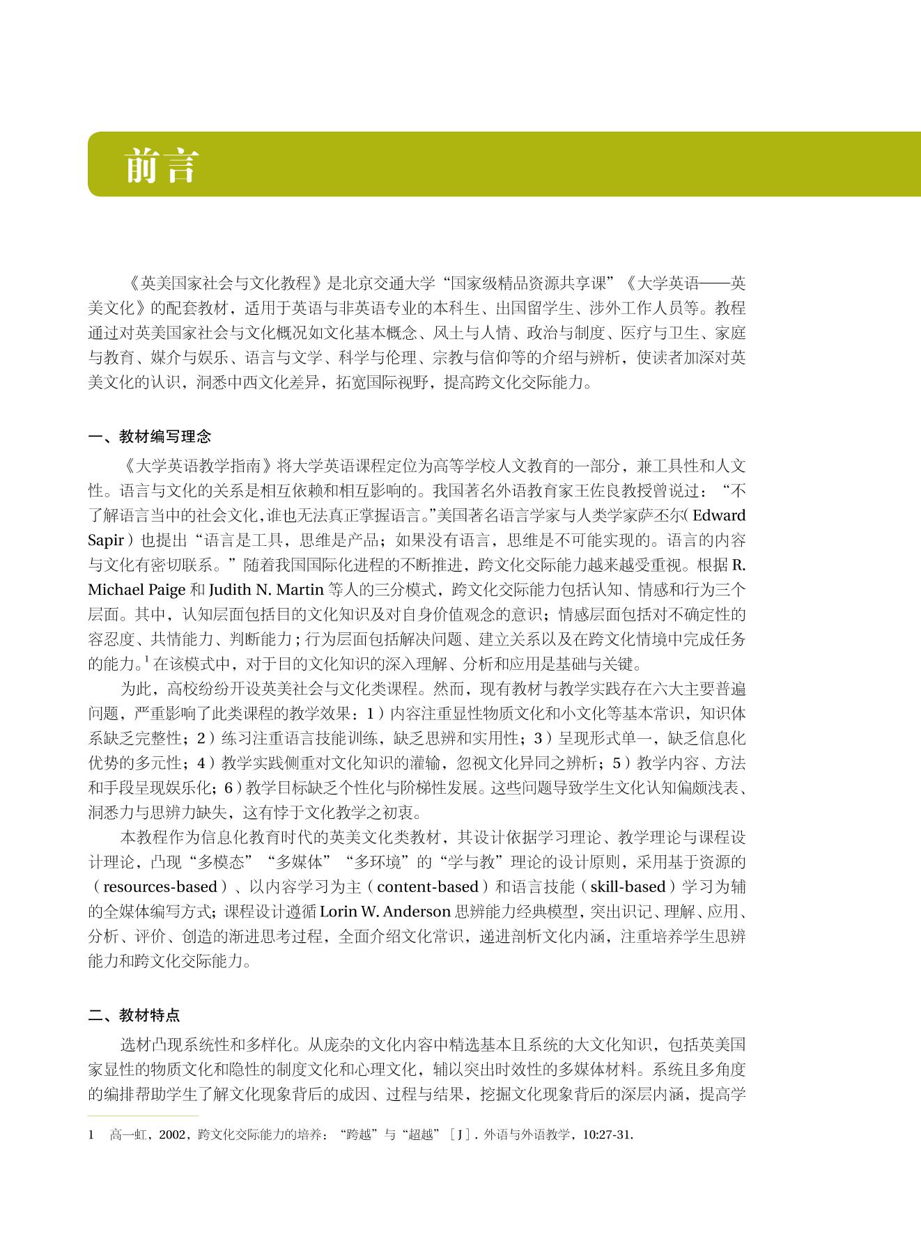 《英美国家社会与文化教程》是北京交通大学“国家级精品资源共享课”《大学英语——英美文化》的配套教材,共11个单元。单元大致按从具体到抽象、从显性到隐性的顺序排列,通过对英美国家社会与文化概况如文化基本概念、风土与人情、政治与制度、医疗与卫生、家庭与教育、媒介与娱乐、语言与文学、科学与伦理、宗教与信仰等的介绍与辨析,使读者加深对英美文化的认识,洞悉中西文化差异,拓宽国际视野,提高跨文化交际能力。本教程适用于英语与非英语专业的本科生、出国留学生、涉外工作人员等。 |