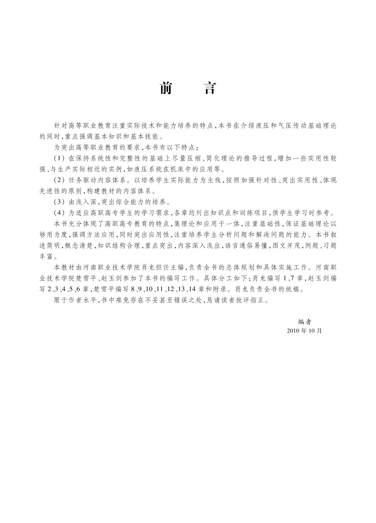 本书从工程应用的角度结合具体工程案例讲述液压与气压传动的基本原理、特点、使用,液压与气动元件及附件的工作原理、基本结构、特点、使用与维护、常见故障及排除,以及液压及气动系统基本回路及其在典型设备中的应用、常见故障及其排除,在每章后面均给出了相应的思考题和练习题。 基于本课程在技能型人才培养机械类课程专业知识、能力构成中的位置及本门技术的特点,本书在编写时突出了在工程实际中训练和提高学生的综合素质及工程能力的特点,注意教、学、做三结合。 本书可作为高等职业技术教育机械、近机类专业教学用书,也可作为教师或企业生产技术人员的参考用书。 |