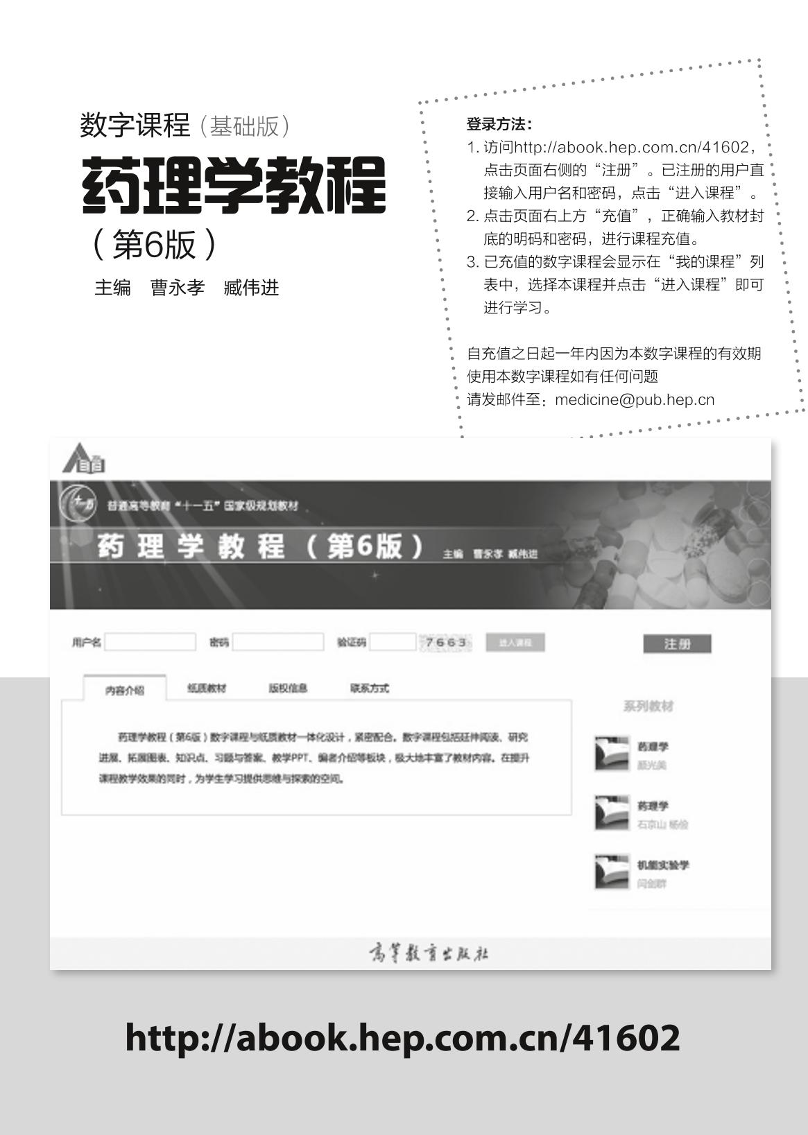 《 药理学教程(第6版)》以药物作用的普遍规律为基本概念, 以代表药物和重点药物为基本内容, 以同类药物的共性为重点,形成条理清晰、重点突出、难点侧重、论点新近、易读易记、易教易学的独特风格。采用“纸质教材+数字课程”的形式,纸质教材包括系统性的、重点的、共性的内容,共8篇43章。数字课程是纸质教材的拓展,加入的延伸阅读、研究进展、扩展图表,利于学习更广阔的知识;加入的知识点、习题与答案和教学PPT,便于学生考试时复习,也可为教师提供参考。本书涵盖了医学生、药学生、执业医师、执业药师必须掌握的药理学知识点,适用于医药学院校临床医学、药学、护理、法医、检验、康复、影像、口腔、麻醉等专业的药理学教学。 |