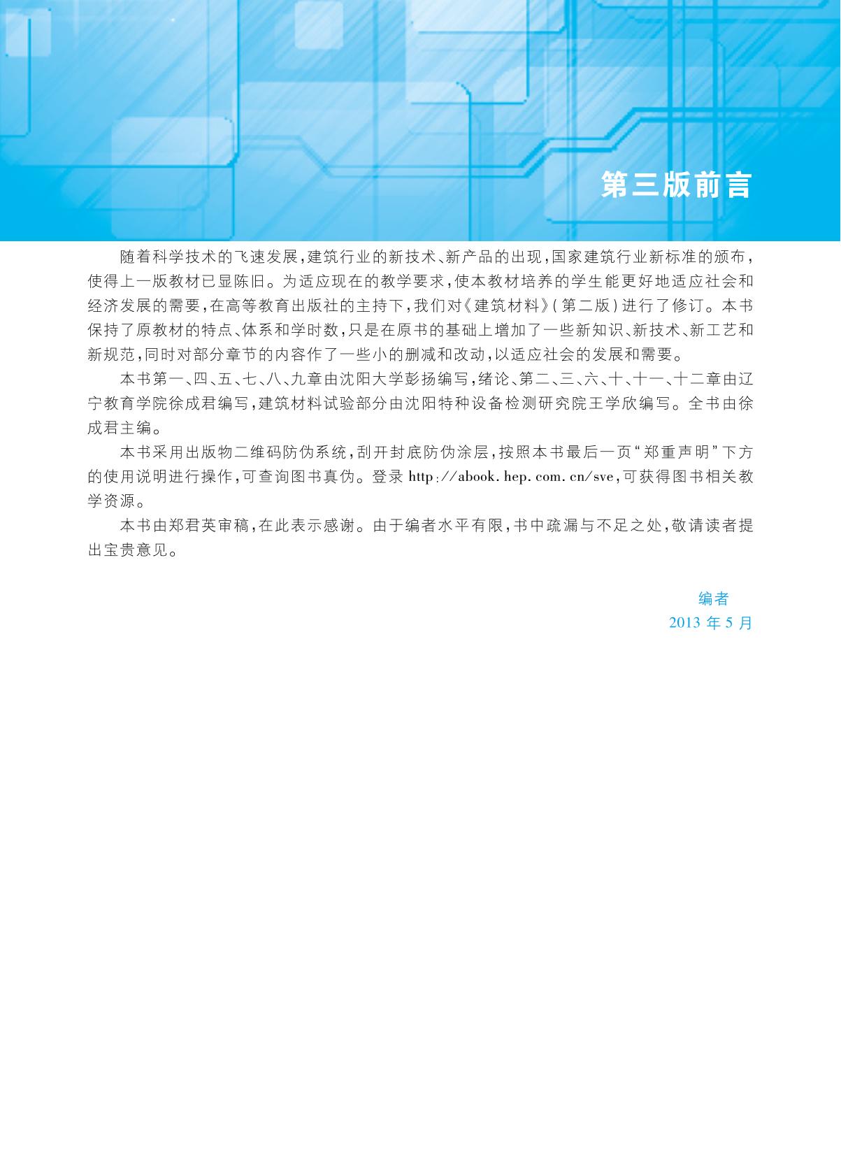 本书是在第二版的基础上,根据建筑业的发展和科学技术的进步,结合各中等职业学校教师在教学使用中提出的意见和国家最新颁布的标准、规范修订而成。修订版保持了原书的体系和简明、实用等优点。全书共分十二章,内容包括:建筑材料的基本性质;石膏、石灰、水玻璃;水泥;混凝土;建筑砂浆;墙体材料;建筑钢材;防水材料;木材;石材;常用装饰材料。结合教学要求,书后附有七个建筑材料试验。本书可作为中等职业学校工业与民用建筑专业教材和建筑施工企业岗位培训教材,也可供有关技术人员、技术工人学习使用。 |