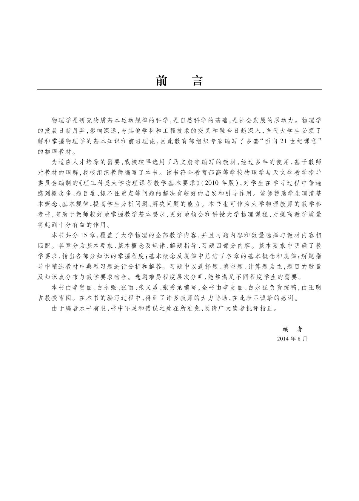 本书是“十二五”普通高等教育本科国家级规划教材的配套辅导书,符合教育部高等学校物理学与天文学教学指导委员会编制的《理工科类大学物理课程教学基本要求》(2010年版),覆盖了大学物理的全部内容。本书共分15章,每章以基本要求、基本概念及规律、解题指导为主要内容,并配备了一定数量的练习题。通过对近170个典型题的分析、解答和讨论,指导学生掌握正确的解题思路和方法,精选了460多个练习题供学生学习和课后训练。选题难易程度层次分明,能够满足不同程度学生的学习需要。 本书可作为普通高校理工科学生学习大学物理的参考书,同时可为大学物理教师提供教学参考。 |