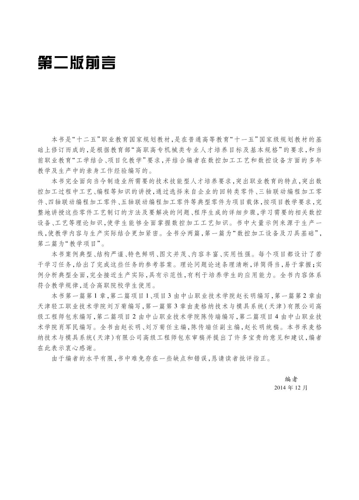 本书是“十二五”职业教育国家规划教材,是在普通高等教育“十一五”国家级规划教材的基础上修订而成的,是根据教育部“高职高专机械类专业人才培养目标及基本规格”的要求编写的。全书分为两篇,第一篇为“数控加工设备及刀具基础”,包括:数控加工设备基础,数控机床机械结构,数控刀具;第二篇为“教学项目”,包括:项目1汽车带轮零件工艺、程序编制及数控车削加工,项目2脚踏板注塑模型腔件工艺、程序编制及数控铣加工,项目3四轴加工中心性能检验试件工艺编制及程序生成,项目4整体叶轮五轴加工中心数控加工工艺编制及程序生成。 本书可作为高职高专院校、成人高校及本科院校举办的二级职业技术学院数控技术、模具设计与制造、机电一体化等专业的教材,也可作为从事数控加工方面的技术人员和操作人员的培训教材。 |