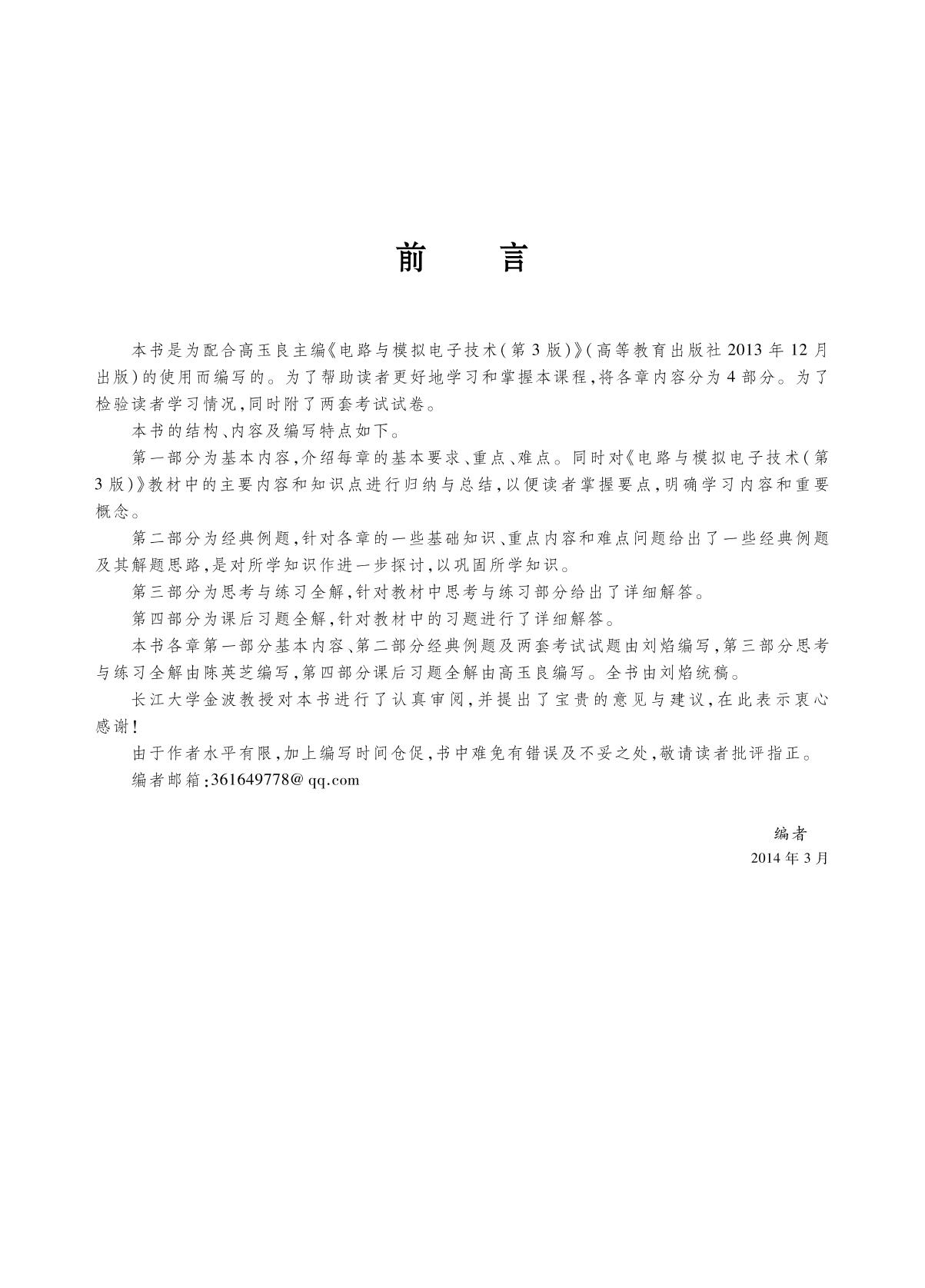 本书是高玉良主编《电路与模拟电子技术(第3版)》的配套教学指导书。全书分为11章,章节顺序与主教材一致。每章内容分为4部分,分别为基本内容、经典例题、思考与练习全解、课后习题全解。基本内容介绍每章基本要求、重点、难点,同时对主教材中的知识点进行归纳与总结;经典例题针对每章的内容给出了一些经典例题及解题思路;思考与练习全解针对主教材中思考与练习部分进行了详细解答;课后习题全解针对主教材中的习题给出了详细解答。 本书可与《电路与模拟电子技术(第3版)》配套使用,也可单独作为高等学校非电类专业“电路与模拟电子技术”课程的辅导书。 \t |