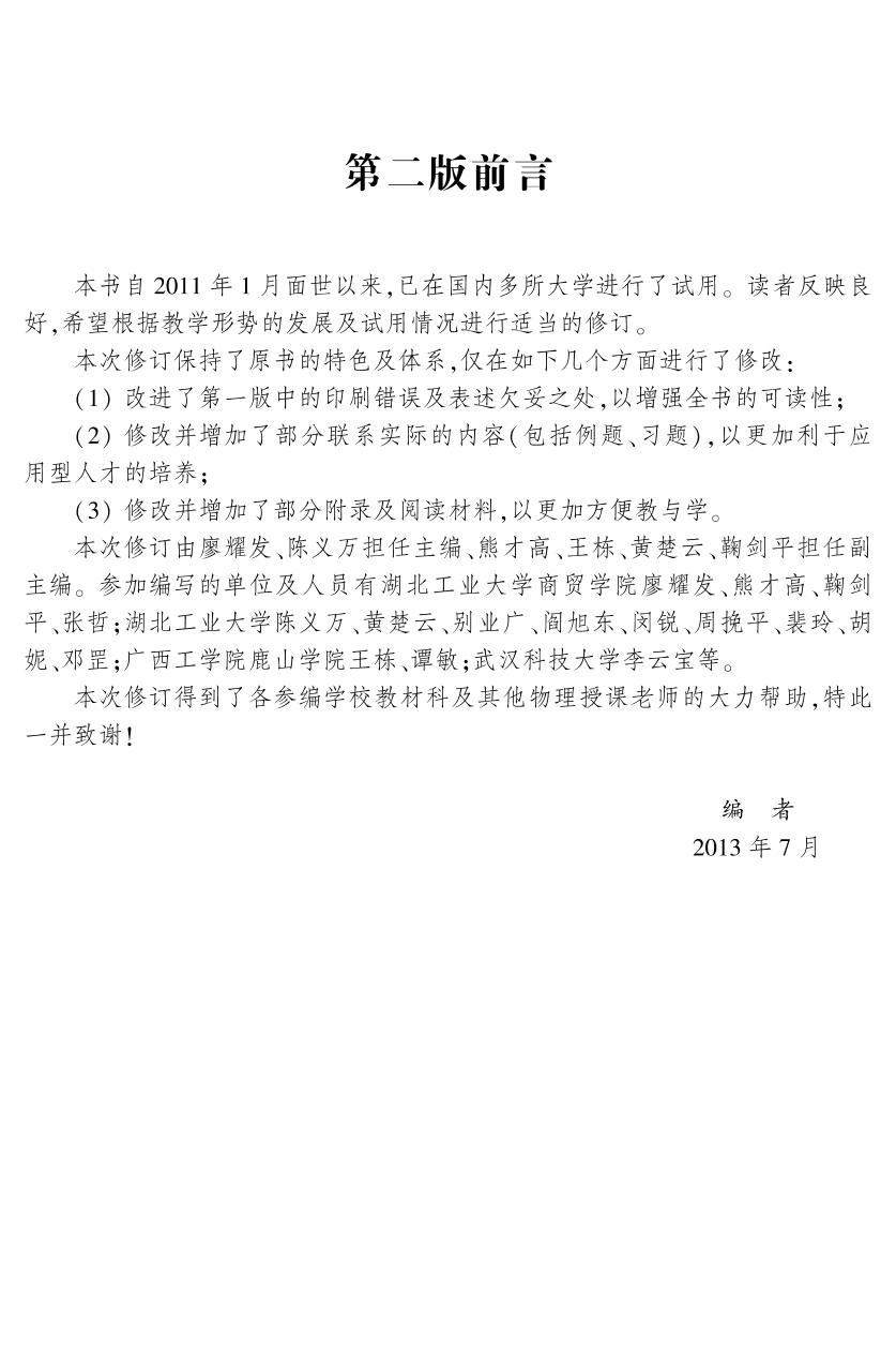 本书是在第一版的基础上,按照教育部高等学校物理学与天文学教学指导委员会编制的《理工科类大学物理课程教学基本要求》(2010年版),本着“加强基础,注重应用,方便教学,浅而简明”的原则修订而成。 本书分上、下两册,上册内容包括力学、振动与波、电磁学三部分;下册内容包括热学、光学、近代物理基础以及现代科学与高新技术的物理基础专题选讲四部分。 本书精选了例题与习题,并适当地降低了它们的难度。此外,本书还配套出版了《大学物理学(第二版)电子教案》、《大学物理学(第二版)学习指导》,以辅助教学。 本书适合于培养应用型人才的一般学校,特别是独立学院非物理类专业大学物理课程(少学时)教学使用,也可供相关科技工作者和社会读者参考。 |