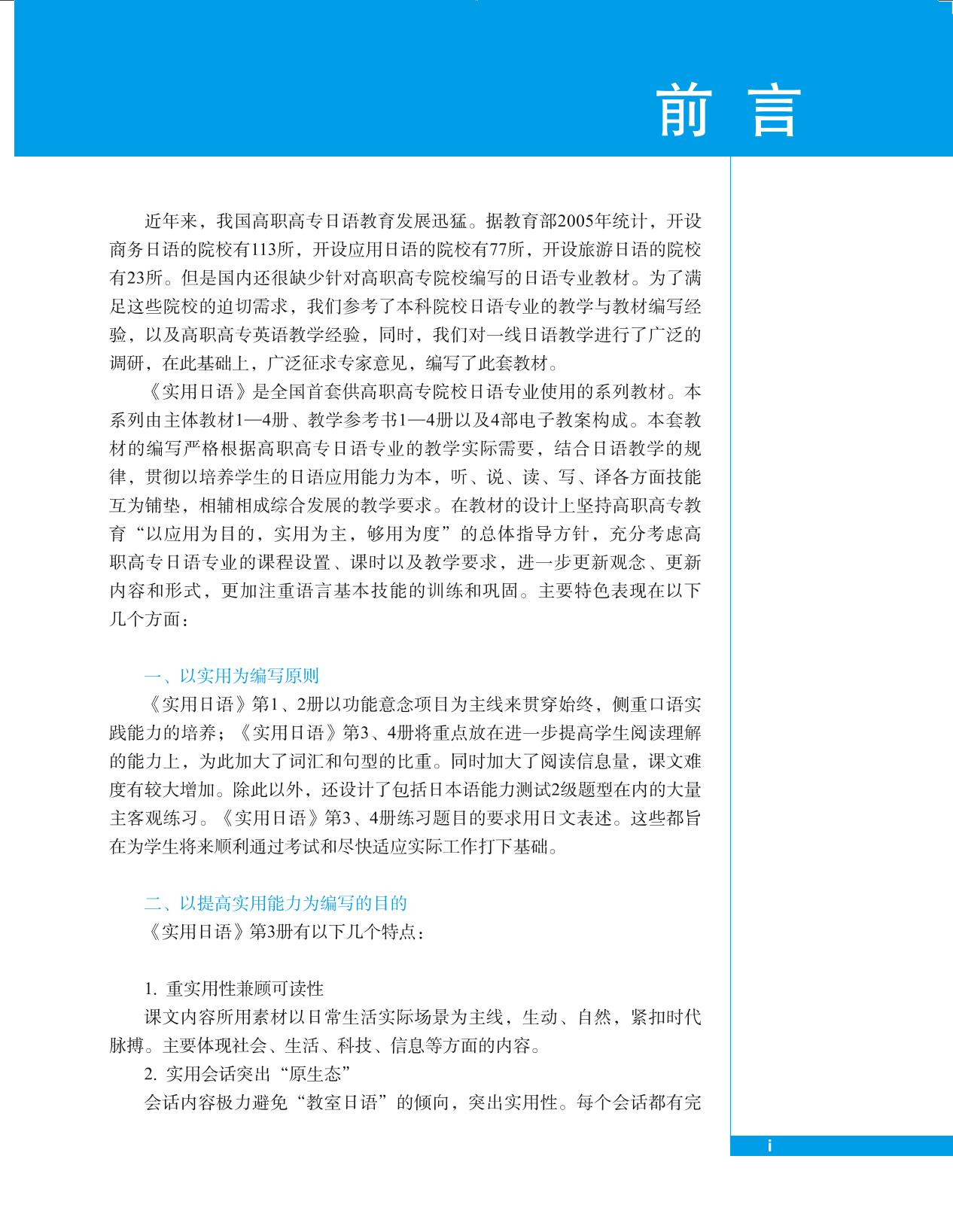 《实用日语》第1、2册以功能意念项目为主线来贯穿始终,侧重口语实践能力的培养;《实用日语》第3、4册将重点放在进一步提高学生阅读理解的能力上,为 此加大了词汇和句型的比重。同时加大了阅读信息量,课文难度有较大增加。除此以外,还设计了包括日本语能力测试2级题型在内的大量主客观练习。《实用日 语》第3、4册练习题目的要求用日文表述。这些都旨在为学生将来顺利通过考试和尽快适应实际工作打下基础。 《实用日语》第3册有以下几个特点: 1.重实用性兼顾可读性。 2.实用会话突出“原生态” 会话内容极力避免“教室日语”的倾向,突出实用性。 3.语言知识涵盖面广。 4.练习形式注重多样化。 5.专栏突出商务礼仪知识。 |