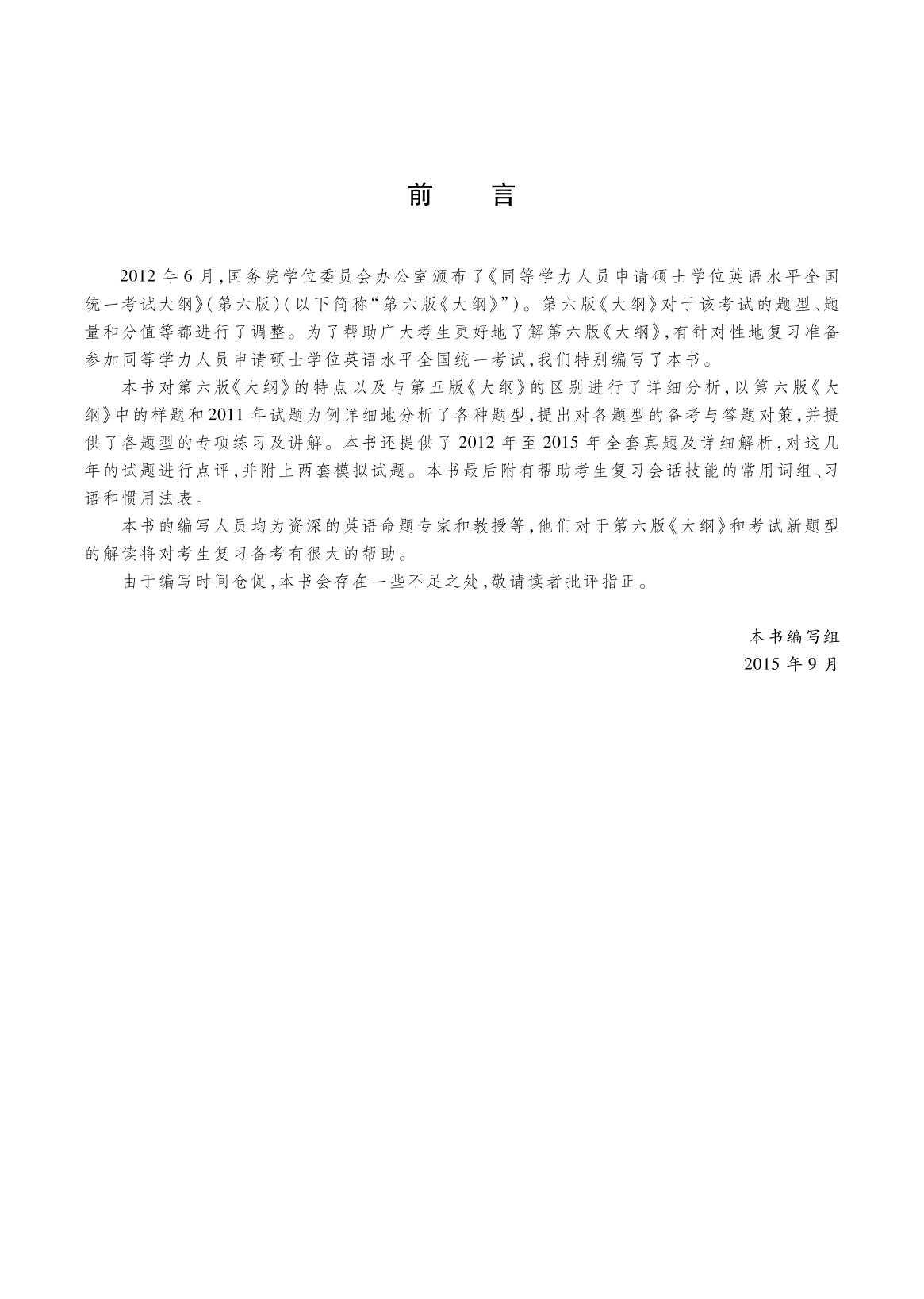 同等学力人员申请硕士学位英语水平全国统一考试指南编写组编著的《同等学力人员申请硕士学位英语水平全国统一考试指南(第六版)》对第六版《大纲》的特点以及与第五版《大纲》的区别进行了详细分析,以第六版《大纲》中的样题和2011年试题为例详细地分析了各种题型,提出对各题型的备考与答题对策,并提供了各题型的专项练习及讲解。本书还提供了2012年至2015年全套真题及详细解析,对这几年的试题进行点评,并附上两套模拟试题。本书最后附有帮助考生复习会话技能的常用词组、习语和惯用法表。