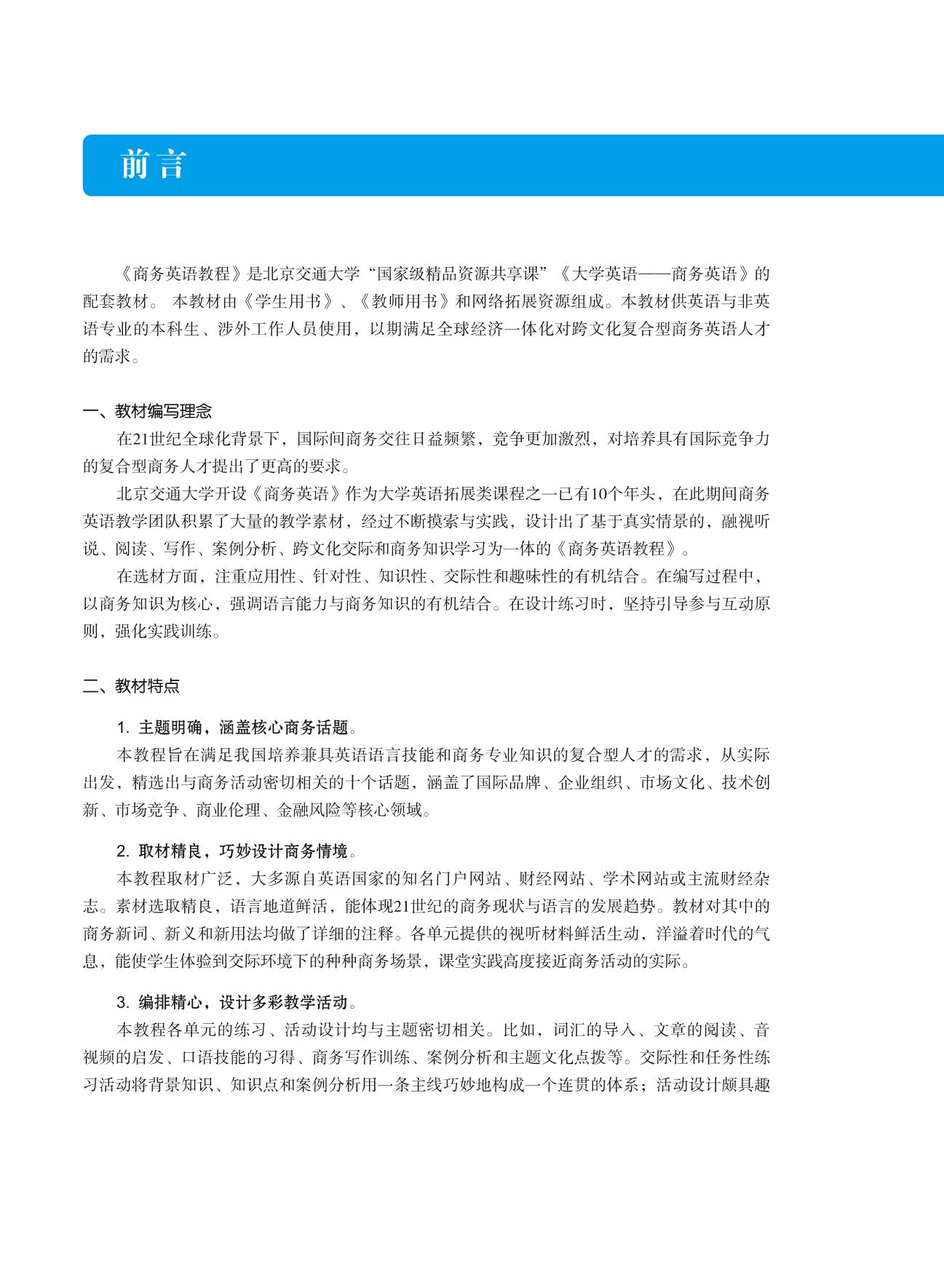 《商务英语教程》是北京交通大学“国家级精品资源共享课”《大学英语——商务英语教程》的配套教材。本教材精选了与商务活动密切相关的十个话题,涵盖国际品牌、企业组织、市场文化、技术创新、市场竞争、商业伦理、金融风险等核心领域。各单元的练习、活动设计将背景知识、知识点和案例分析用一条主线巧妙地构成一个连贯的体系;小组讨论、角色扮演、图表解读、情景分析、学生微视频等各项活动设计能突出教学过程中学生的主体地位和教师的主导作用。商务案例分析使学生能体验到较为逼真的商务环境,在模拟的商务情境中锤炼学生在语言、商务沟通、信息摄取、创新思维、解决问题以及批判性思维等各方面的能力,这些综合能力的培养对他们未来的商务活动会有极大的帮助。 |