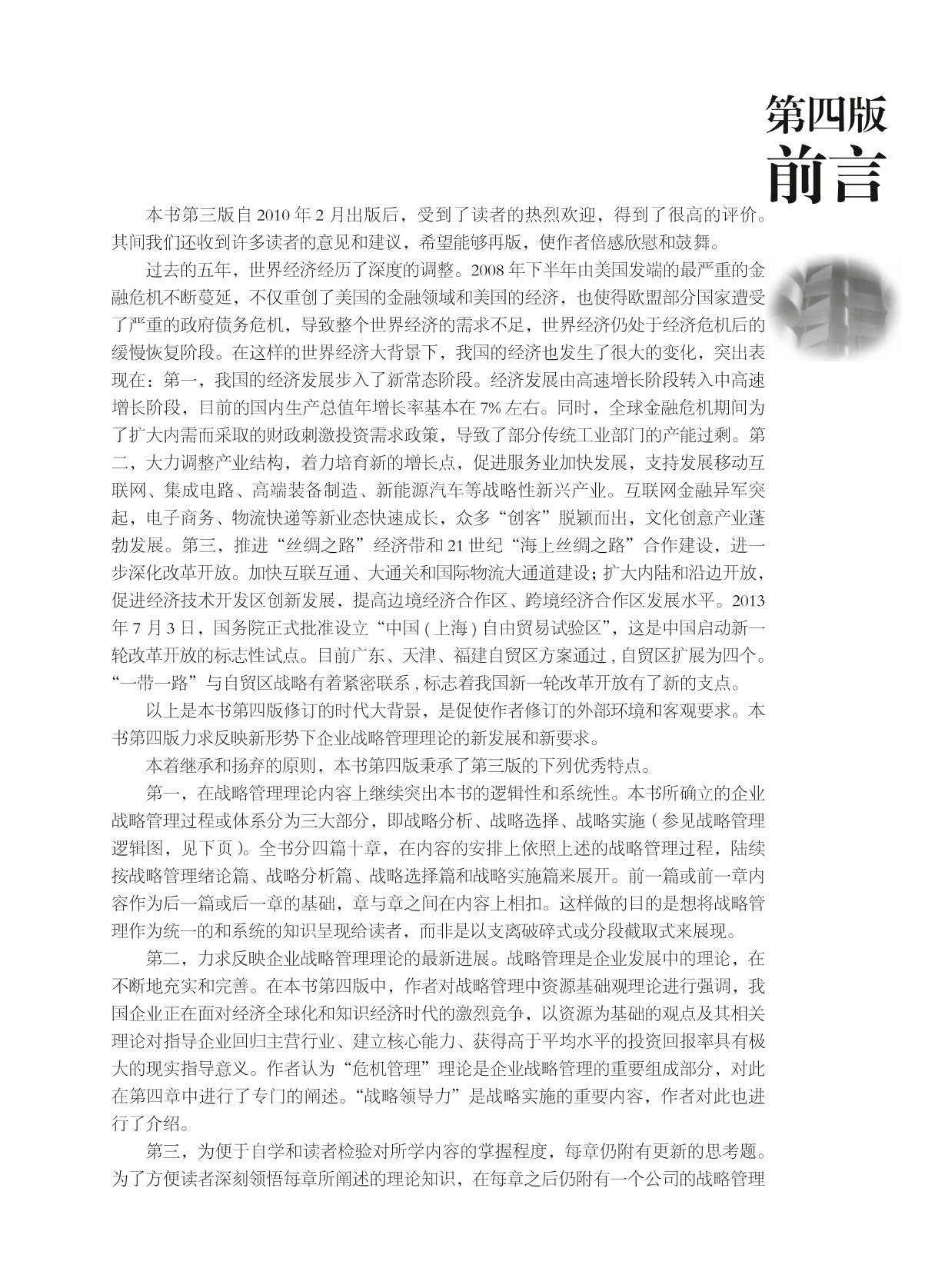 本书是一部关于企业战略管理方面的教材。本书基于战略分析、战略选择、战略实施三个部分的战略管理过程架构体系,系统而全面地阐述了企业战略管理的基本理论和方法。全书共分四篇十章:第一篇介绍企业战略管理理论的发展历史、战略管理的系统和过程,以及战略管理中的一些重要概念;第二篇分析企业的外部环境因素和内部条件、内部条件分析的方法,以及企业社会责任和战略目标;第三篇论述公司层面的战略选择、经营单位层面的竞争战略,以及企业国际化战略问题;第四篇从组织结构、战略领导和管理战略变革等方面论述战略的实施等内容。在每章理论阐述之后,都附有思考题和与该章内容相符的案例。 本书适合于管理学科高年级本科生和研究生(包括MBA 学员)作为教材之用,也可作为企业高层管理人员的培训教材,还可供管理专业教学科研人员参考阅读。 |