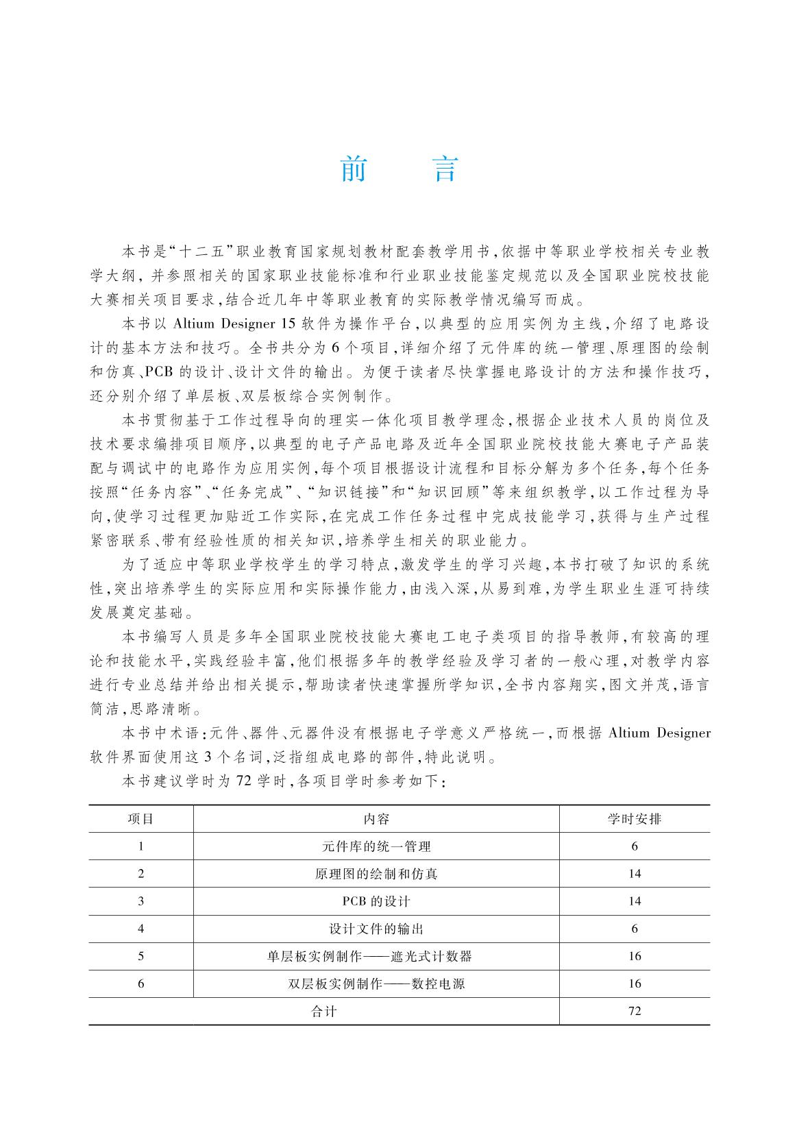 本书是“十二五”职业教育国家规划教材配套教学用书,依据中等职业学校相关专业教学标准,并参照相关的国家职业技能标准和行业职业技能鉴定规范以及全国职业院校技能大赛相关项目要求,结合近几年中等职业教育的实际教学情况编写而成。 本书主要内容包括元件库的统一管理、原理图的绘制和仿真、PCB的设计、设计文件的输出、单层板实例制作——遮光式计数器以及双层板实例制作——数控电源。 本书配有学习卡资源,请登录Abook网站http://abook.hep.com.cn/45042/获取相关资源。详细说明见本书“郑重声明”页。 本书可作为中等职业学校电子技术应用、电子与信息技术等相关专业教材,也可作为相关培训用书。 |