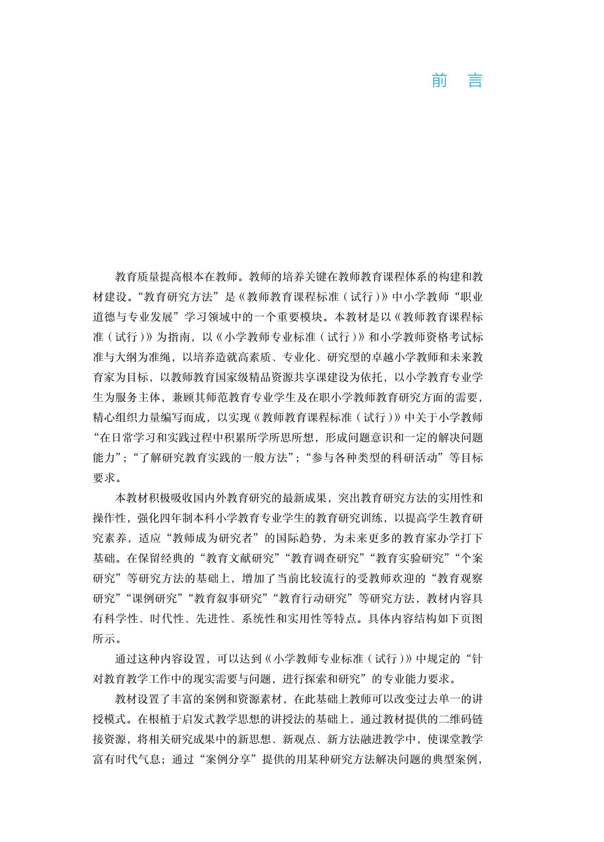 本教材是教师教育国家级精品资源共享课“教育研究方法”配套教材,依据《教师教育课程标准(试行)》编写。内容编写以“育人为本,实践取向”为指导思想,以作者多年来积累的教学与研究经验为基础,以小学教育研究中的真实案例为基本学习情境。根据小学教师教育研究的特点及需要,以及《小学教师专业标准(试行)》、小学教师资格考试标准和大纲的要求,将内容分为四大块十一章:教育研究基本理论、传统教育研究方法、现代教育研究方法、教育研究成果表述。其中,教育研究基本理论主要包括教育研究的意义、对象、原则、选题、设计等相关内容;传统教育研究方法主要包括教育文献研究、教育调查研究、教育实验研究、个案研究;现代教育研究方法主要包括教育观察研究、课例研究、教育叙事研究、教育行动研究;教育研究成果表述主要由如何撰写学术论文和学位论文构成。 本教材既可以作为高师院校小学教育专业本、专科教材,也可以作为其他师范教育专业教育学专业本、专科生及研究生的教学参考书,以及在职小学教师继续教育培训教材。 |