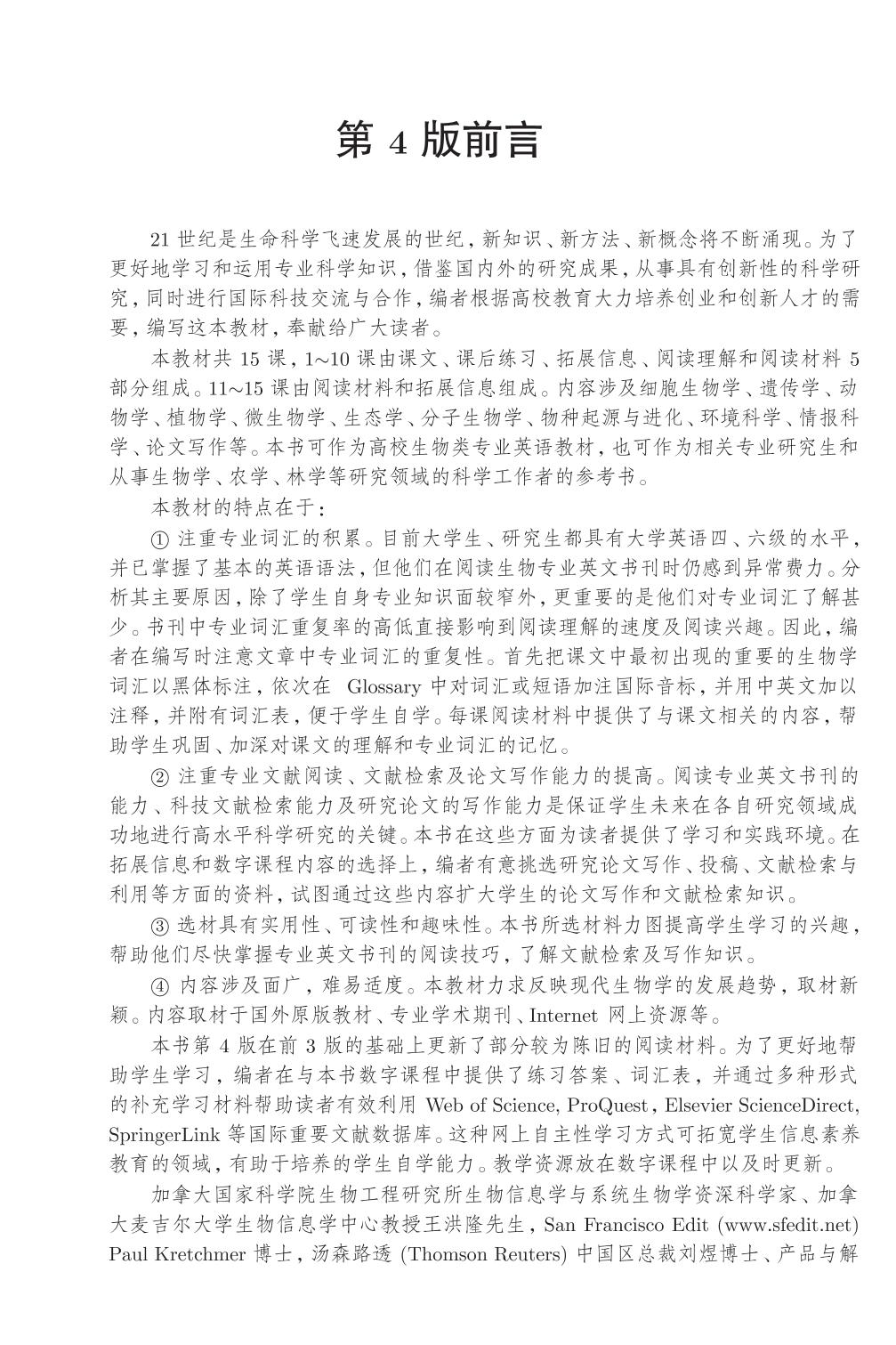 本书共分15课,1~10课由课文、课后练习、拓展信息、阅读理解和阅读材料5部分组成。11~15课,由阅 读材料和拓展信息组成。本书数字课程中配有Glossary of Biological Terms、第1章至第10章的Answers to Exercises及补充学习材料。书中内容涉及细胞生物学、遗传学、动物和植物科学、微生物学、生态学、分子生物学、物种起源与进化、环境科学、情报科 学、论文写作等方面。 本书可作为高校生物学专业英语教材,也可作为相关专业研究生和从事生物学、农学、林学等研究领域的科学工作者的参考工具书。 |