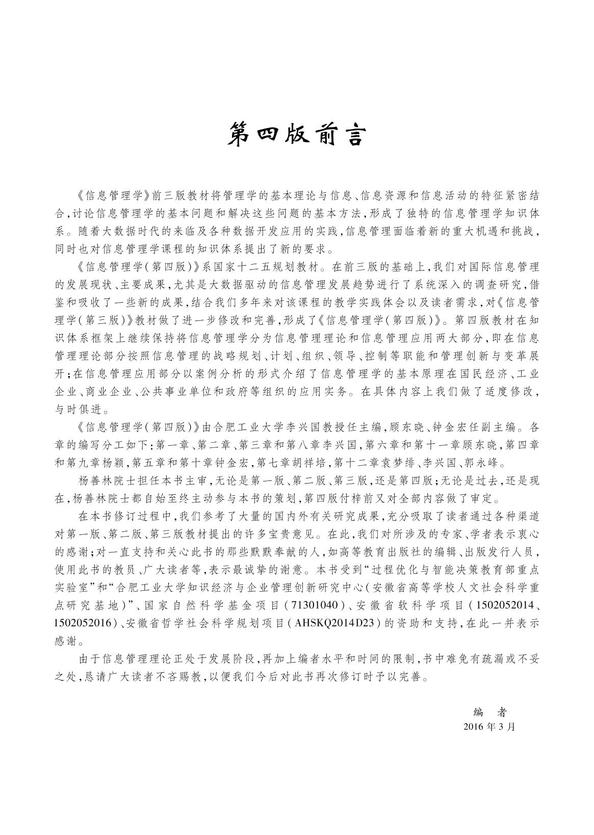 本书是面向21世纪课程教材,是普通高等教育“十五”“十一五”和“十二五”国家级规划教材?本书将管理学的基本理论与信息、信息资源和信息活动的特征结合起来,建立了信息管理学的新体系,在此基础上讨论信息管理学的基本问题和解决这些问题的基本方法,并按照信息管理的战略规划、计划、组织、领导、控制等职能和管理创新与变革展开?全书共分两篇十二章:第一篇信息管理理论包括总论、信息战略规划、信息管理计划、信息管理组织、信息管理领导、信息管理控制、信息化与管理变革七章,第二篇信息管理应用包括国民经济信息管理、企业信息管理、商业信息管理、公共事业信息管理、政府信息管理五章? 本书可作为高等学校信息管理与信息系统专业和其他管理类专业、经济类或信息类专业的“信息管理学”课程教材,也可供mba、mpa、管理类工程硕士以及社会读者研读? |