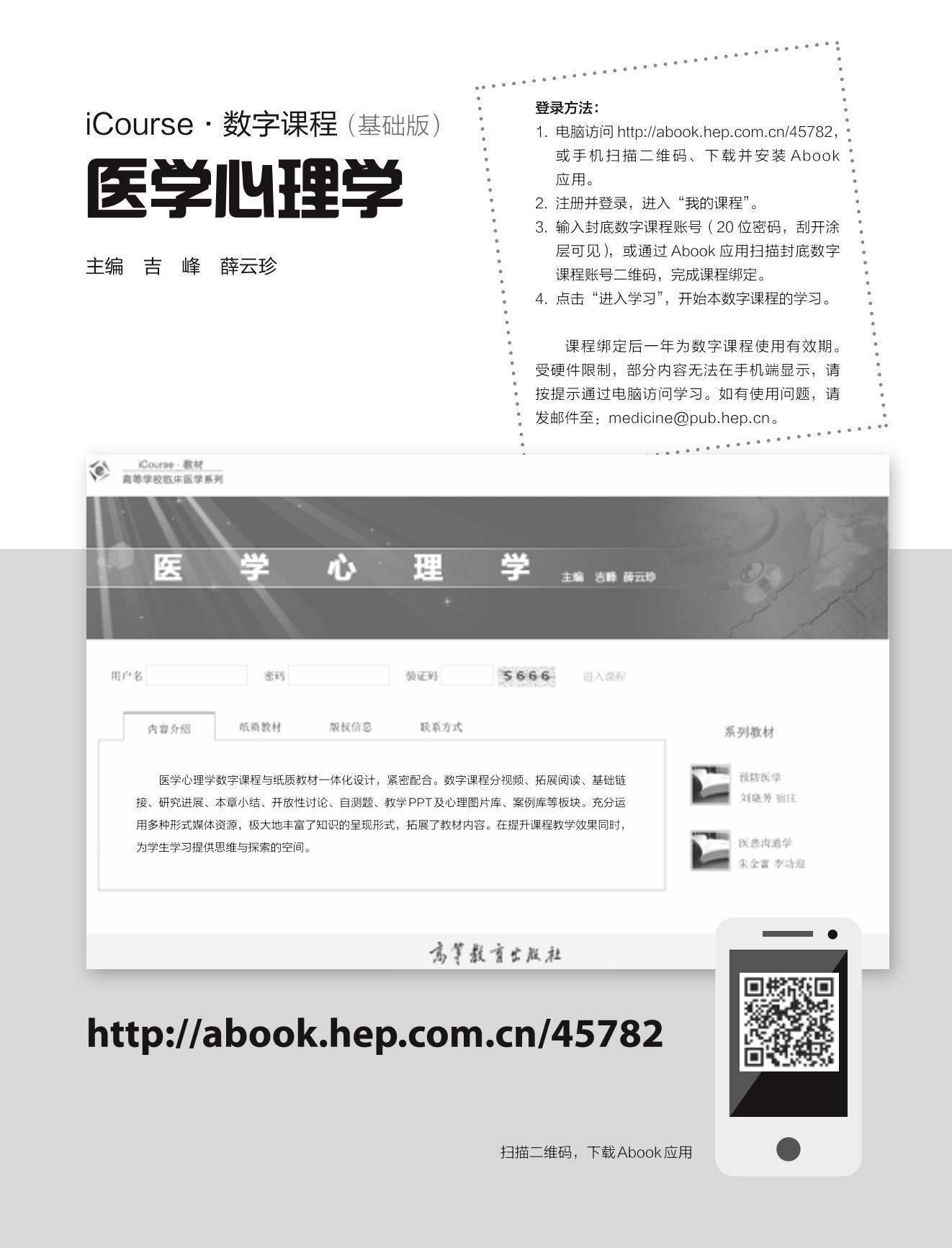 全书以基础篇、临床篇和技能篇共三篇十章呈现,每一章的知识脉络以知识导图的形式呈现,使医学心理学课程体系层次、知识点之间的关系更清晰。技能篇心理评估和心理治疗编写比例的增加,使教材更贴近临床、更实用、更可操作。全书纸质内容与数字化资源一体化设计,数字课程包括视频、拓展阅读、基础链接、研究进展、图片库、心理测验及临床案例、本章小结、教学PPT、自测题、开放性讨论等内容,使本书成为一本既可读又可视的“有声有色”的新形态教材,利于学生自主学习,拓展视野及知识面。 本书适用于高等学校临床、基础、预防、护理、检验、口腔、药学等专业学生,也是学生参加执业医师考试及住院医师规范化培训的必备书,还可供临床医务工作者和医学研究人员参考使用。 |