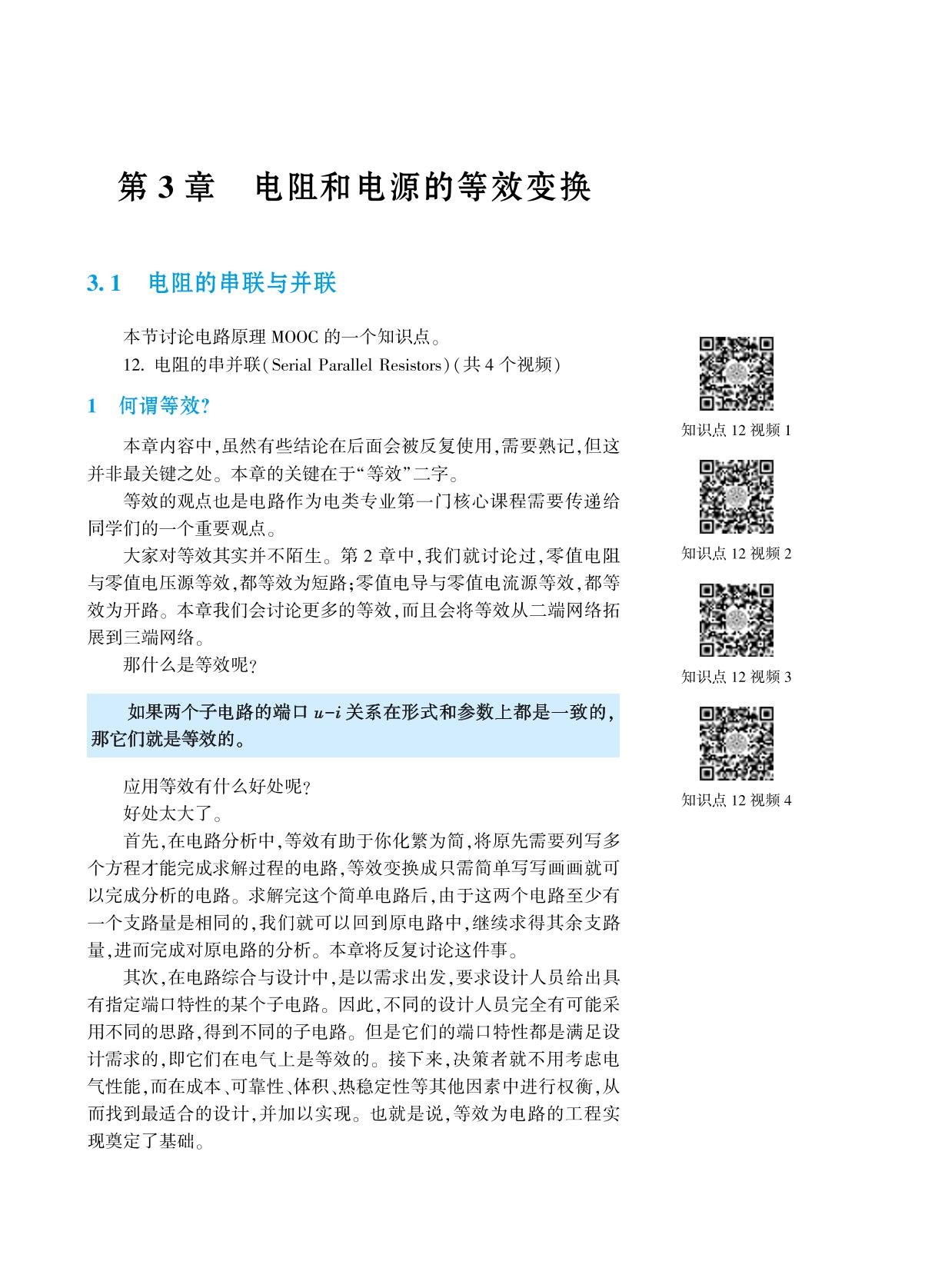 本书主要内容包括三大部分:电阻电路、动态线性电路的暂态分析和动态线性电路的稳态分析。电阻电路的内容包括简单电阻电路的等效变换、线性电阻电路的分析方法和电路定理、非线性电阻电路;动态线性电路的暂态分析内容包括一阶电路及二阶电路的经典分析方法、状态方程、冲激响应和卷积积分;动态线性电路的稳态分析内容包括相量法分析正弦稳态电路、动态电路的频率响应、谐振、互感与变压器、三相电路、周期非正弦电路分析等。 本书内容符合教育部高等学校电子信息科学与电气信息类基础课程教学指导分委员会于2004 年制定的电路分析基础教学基本要求。本书最大的特点是与“学堂在线”(WWW.XUETANGX.COM)中清华大学“电路原理”MOOC课程配套,书中提供了该MOOC课程中所有内容的二维码链接;同时也适合普通高等学校电气电子专业师生使用,或为相关科技人员提供参考。 |