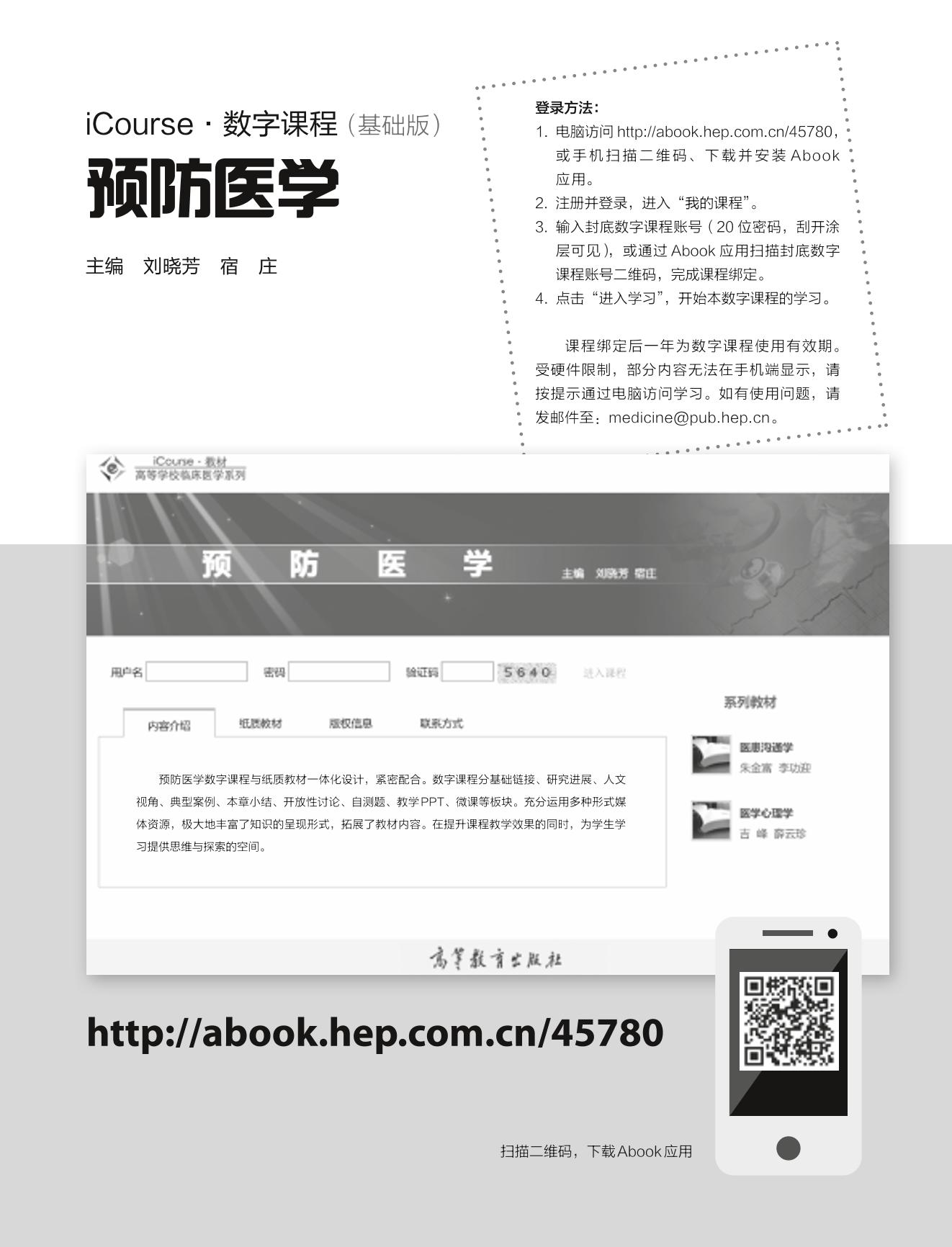 本书共分三篇十七章。第一篇为环境与健康,包括人与环境、生活环境与健康、食物与健康、职业环境与健康。第二篇为常见医学统计学方法,包括医学统计学概述、数值变量资料的统计分析、分类变量资料的统计分析、秩和检验、直线回归与相关、统计表与统计图。第三篇为流行病学的应用,包括疾病的分布、描述流行病学、分析流行病学、实验流行病学、诊断性试验的研究与评价、病因与病因推断、疾病的预防控制。本书结合临床医学特点,内容精练、系统化,语言通俗易懂。全书纸质内容与数字化资源一体化设计,数字课程涵盖了基础链接、研究进展、人文视角、本章小结、开放性讨论、教学PPT、自测题、典型案例、微课等资源,有利于学生自主学习,提升教学效果。 本书适用于高等学校临床、基础、预防、护理、检验、口腔、药学等专业学生,也是学生参加执业医师考试及住院医师规范化培训的必备书,还可供临床医务工作者和医学研究人员参考使用。 |