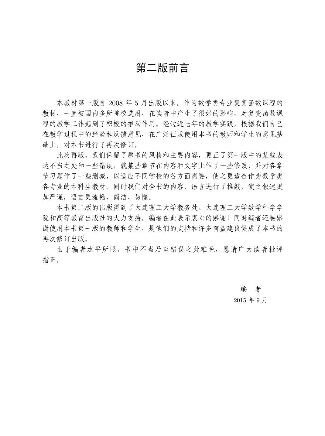 本书是普通高等教育“十一五”国家级规划教材,覆盖了复变函数的基本内容,力求语言简洁,并且对读者的数学基础要求较低。书中强调几何背景和应用,给出了许多在工程技术以及物理学等学科中的应用实例,同时配有大量难易程度不同的习题供读者选做。 全书共分八章,包括:复数与复变函数、解析函数、复变函数的积分、解析函数的级数展开、留数、保形映射、解析开拓、调和函数,其中有些内容在教学中可以根据实际情况作出取舍。 本书可作为数学类专业复变函数课程的教材,也可作为工程技术人员的参考书。 |