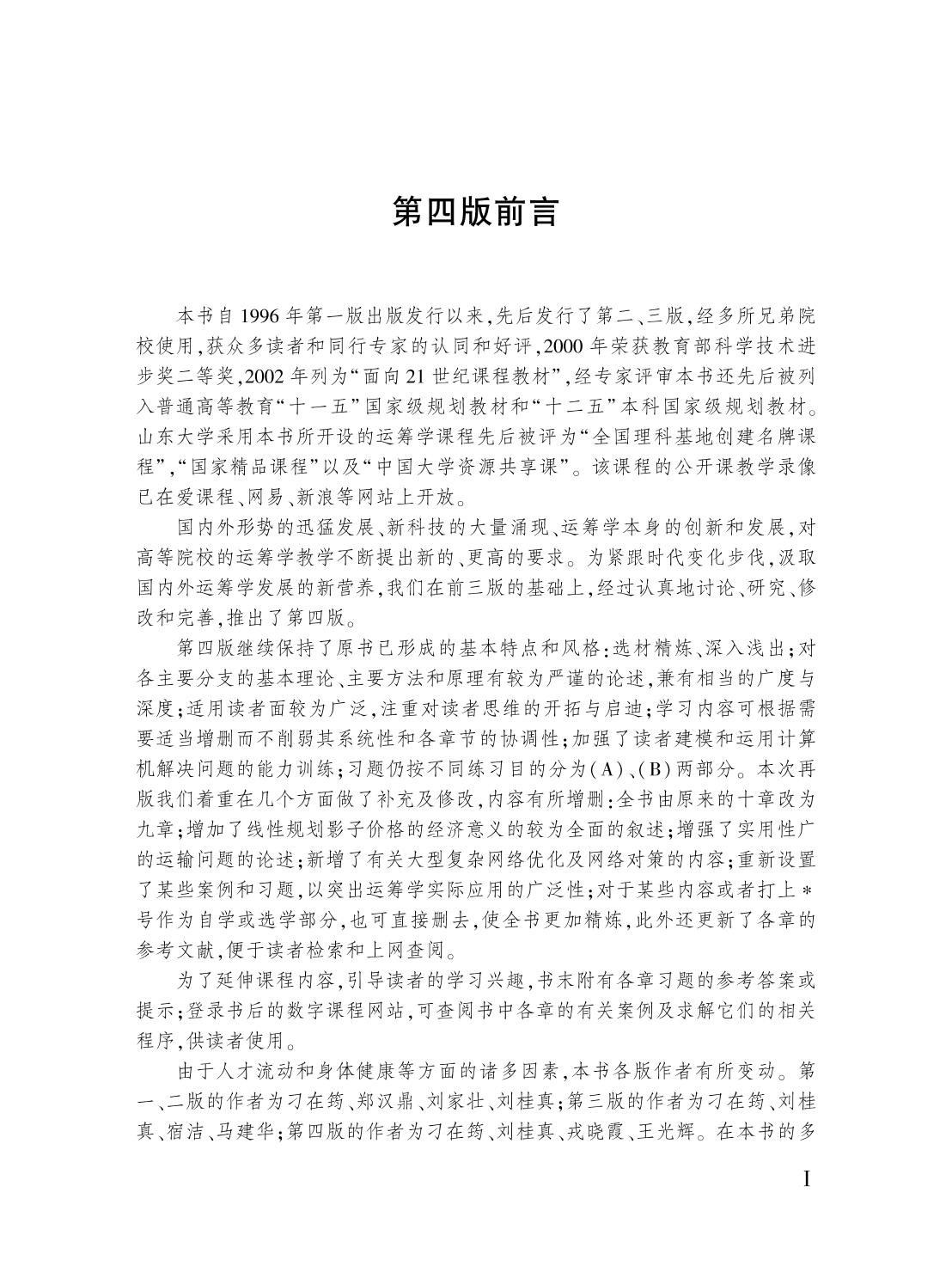 本书是“十二五”普通高等教育本科国家级规划教材,在第三版的基础上修订完善而成,主要内容有线性规划、整数线性规划、非线性规划、动态规划、图与网络分析、网络计划技术、排队论、决策分析、对策论等。 第四版继续保持了前三版的厚理论、宽口径、理论联系实际的特点和精炼、严谨的风格,第三版的绪论精炼为运筹学简介,作为引言,并结合当前的研究热点——复杂网络及大数据分析,在“图与网络分析”中增加了“复杂网络简介”,在“对策论”中增加了“网络对策”。此外对部分章节的内容和习题根据需要进行了增删或修改。习题分为(A),(B)两部分,难度有所差异,可供读者选择。教材配套的数字课程包含各章相关的应用实例和程序。 本书可作为数学与应用数学、信息与计算科学、金融数学等专业的运筹学课程教材,也可作为管理、系统工程等专业的专业课程教材。 |