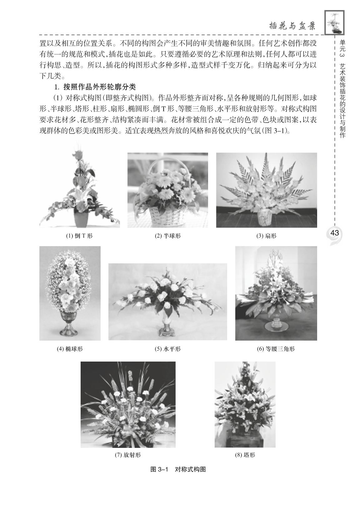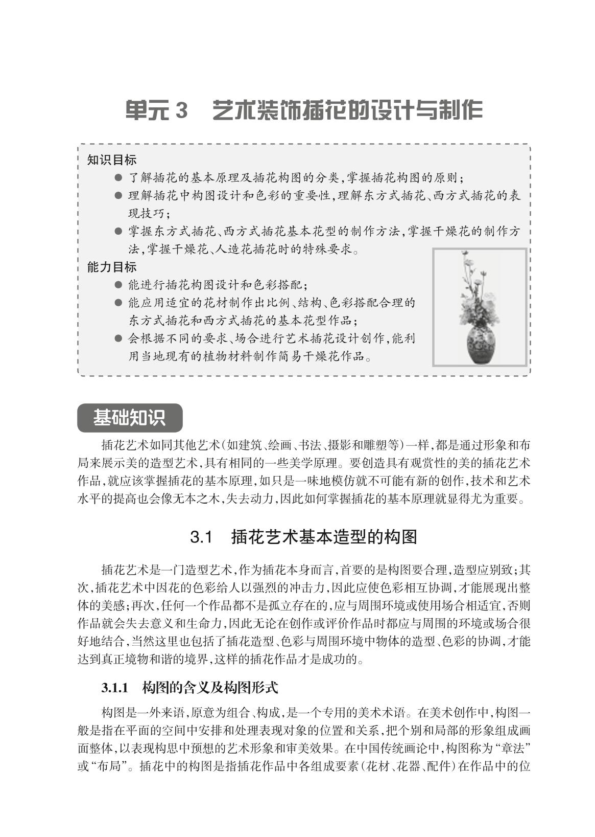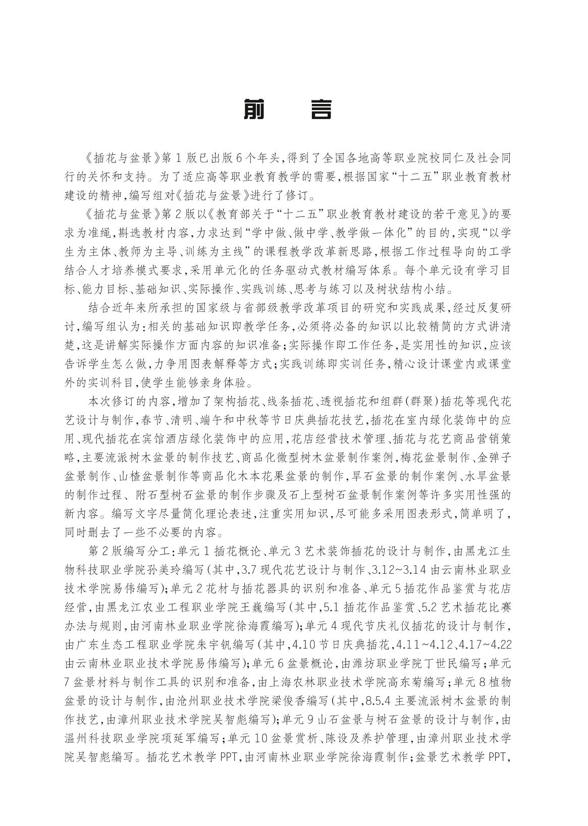 本书是全国高职高专教育规划教材。 本书依据高等职业教育教学改革的需要,以应用为目的,强调内容的针对性和实用性。 全书内容分插花和盆景两部分,共10个单元。插花部分包括:插花概论、花材与插花器具的识别和准备、艺术装饰插花的设计与制作、现代节庆礼仪插花的设计与制作、插花作品鉴赏与花店经营。盆景部分包括:盆景概论、盆景材料与制作工具的识别和准备、植物盆景的设计与制作、山石盆景与树石盆景的设计制作、盆景赏析、陈设及养护管理。每个单元都安排有若干个教学任务、工作任务和实训任务。 本书可作为高职高专院校、本科院校举办的职业技术学院、五年制高职及成人教育学院园林技术、园林工程技术、园艺技术、商品花卉专业的教材,可供相关行业生产和管理员以及花卉盆景爱好者使用,也可供中等职业学校教学参考。 |