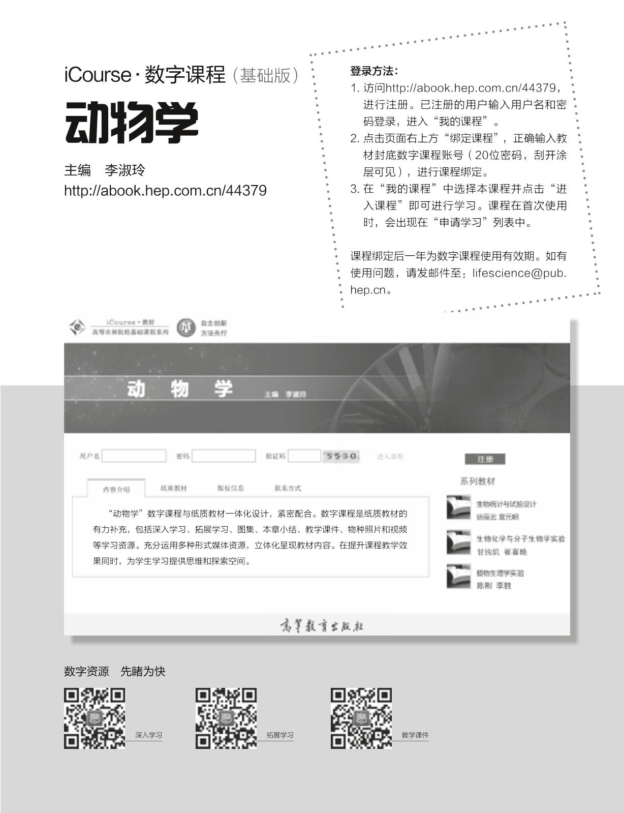 本教材以动物生命活动与环境的关系以及动物进化为主线,图文并茂地讲解动物的主要特征;在分类部分突出重要类群,重点介绍与人类生产生活密切相关的代表种类。共设19 章,内容包括绪论、动物体的基本结构、无脊椎动物和脊椎动物各代表类群。采用“纸质教材+ 数字课程”的出版形式,纸质教材突出系统而精炼的特点,数字课程作为纸质教材的有力补充,丰富了教学内容并提高知识的整体性和趣味性。