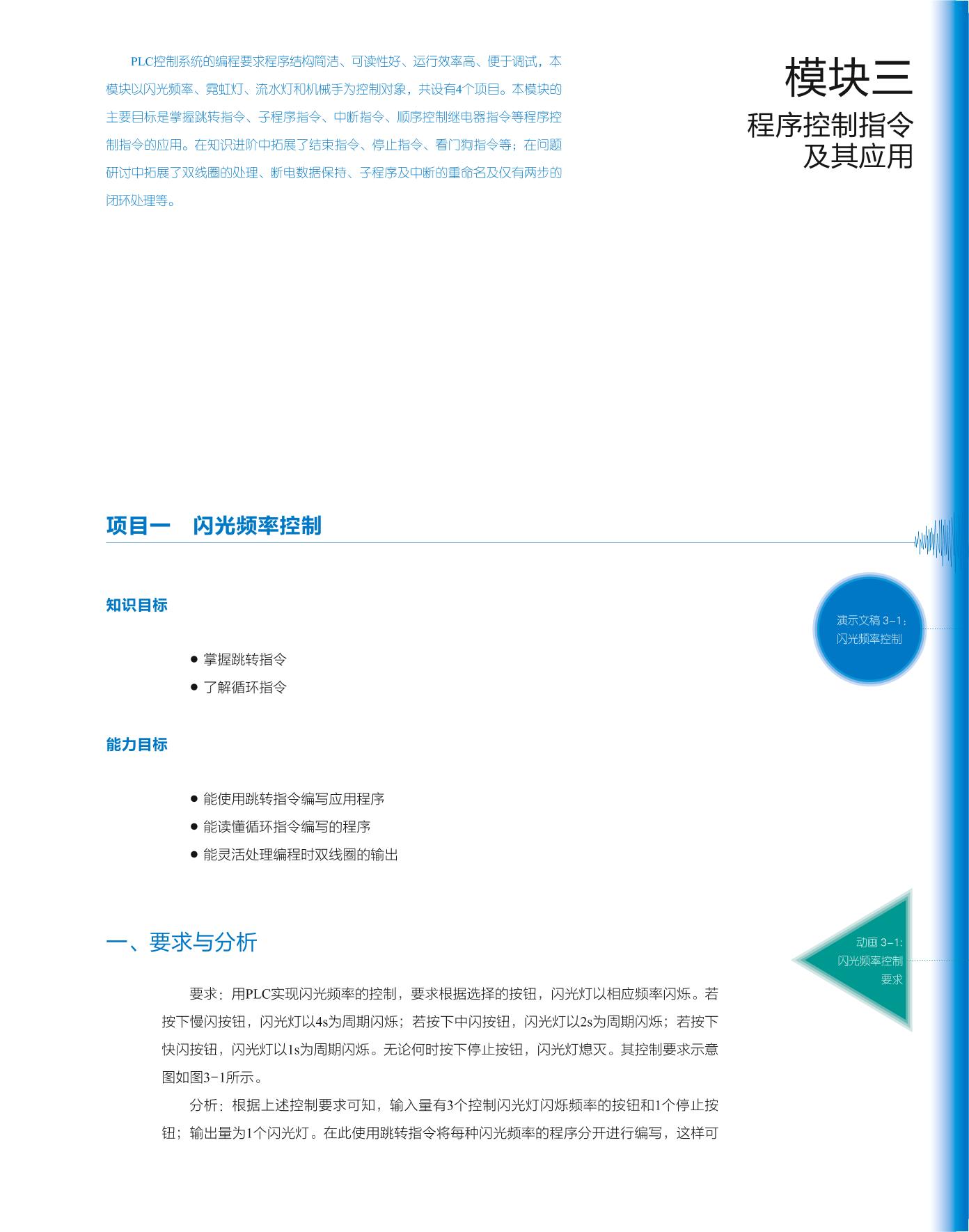 本书主要以西门子S7-200 系列PLC为例,分5个模块共20个项目,较为详尽地介绍S7-200 PLC的基础知识、编程软件、位逻辑指令、数据处理指令、程序控制指令、模拟量指令、脉冲量指令、通信指令及其工程应用。每个项目都以“教学做”一体化模式编写,选题均来自于工业生产现场,并经过编写组精心设计教学项目,试做后编入教材,强调职业技能训练,注重职业能力培养。在项目实施中均配有电路原理图和控制程序,并使项目易于操作与实现,旨在让读者通过本书的学习,尽快掌握S7-200 PLC的基本知识及编程应用技能。 本书还借助现代信息技术,配有数字课程网站,包括教学课件、微课、动画、仿真训练、训练参考程序等教学资源,在书中的关键知识点和技能点的配套资源处插入了二维码标识,顺应现代学习方式,让学习变得方便快捷。 本书可作为高等职业院校电气自动化、机电一体化等相关专业教材,也可作为工程技术人员自学或参考用书。 |