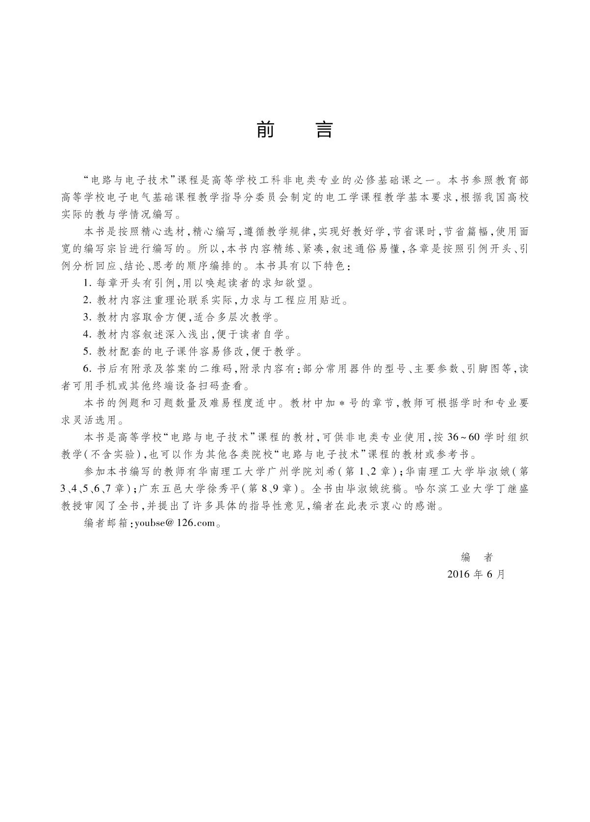 本书系统地阐述了电路与电子技术的基本理论、分析方法和应用。 全书共9章,分三个部分。第一部分为电路基础,内容包括交、直流电路分析、三相电路等。第二部分为模拟电子技术,内容包括电子器件、放大电路、集成运算放大器。第三部分为数字电子技术,内容包括组合逻辑电路和时序逻辑电路等。 全书各章开头有引例,结尾有引例分析,每节有思考题。每章例题和习题数量与难易度适中,书后有附录及答案,以二维码形式给出,读者可用手机或其他终端设备扫码查看。 本书可作为高等学校非电类专业“电路与电子技术”课程的教材,也可作为其他院校“电路与电子技术”课程的参考资料。 |