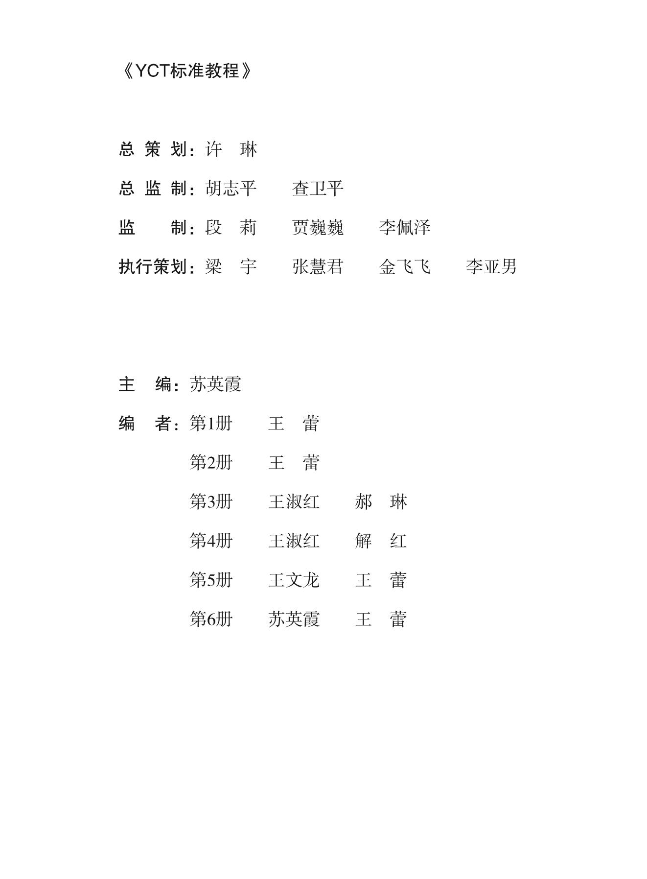 为鼓励汉语非第一语言的中小学生学习汉语,培养、提高他们的汉语能力,自2004年以来,中国国家汉办组织中外汉语教学、语言学、心理学和教育测量学等领域的专家,在充分调查、了解海外中小学实际汉语教学情况的基础上,开发了新中小学生汉语考试(YCT)。 每年参加YCT考试的考生达5万多人次,但尚没有一套完全符合YCT大纲和考试的教材,《YCT标准教程》将填补这一空白。一、编写理念:考教结合。教:紧扣大纲、贴近生活、寓教于乐,考:模拟真题、随学随练。二、适用对象:海外汉语非第一语言的小学生。此教程为通用型教材,稍微偏重欧美地区。三、教程构成:第一册对应YCT(一级),第二册对应YCT(二级),第三、四册对应YCT(三级),第五、六册对应YCT(四级)。四、每册和每课内容:(1)每册教材共12—15课,每课后面安排一个模拟测试,题型与真题完全相同。(2)每课内容包括热身、课文、生词、练习、活动、测试等。