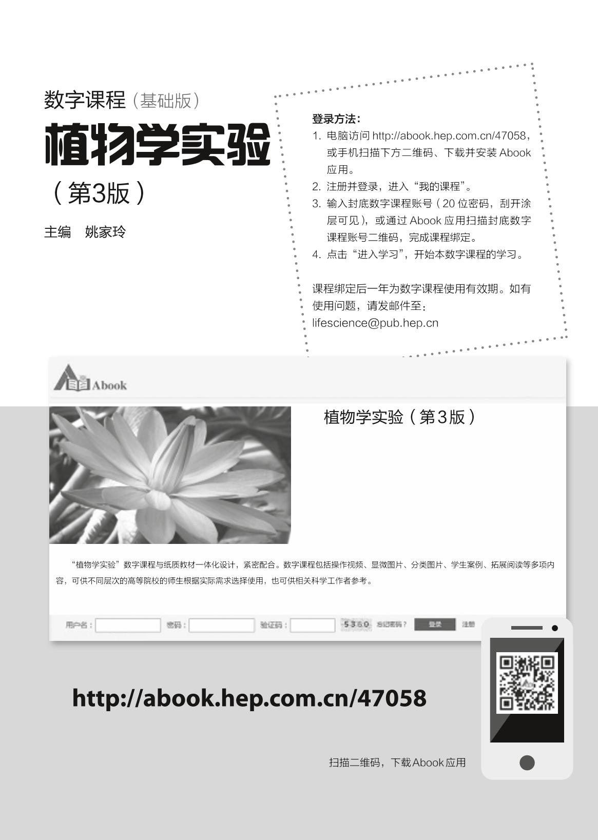 《植物学实验》(第3版)保留了第2版的主要内容和特点,以推进探究式、自主性教学模式为原则,并顺应互联网背景下信息技术在高等院校教学中的应用趋势。全书实验以植物形态结构和系统及分类为主线,分基础和综合两个层次组织设计,并附有综合设计性实验案例。同时还有为本版教材配套建设的数字课程,包括60 多幅植物显微图片、数百张被子植物的形态图片、植物学主要实验技术的操作视频、实验案例及部分附录等。 本书内容简明,实用性和可操作性强,适合作为高等农林、师范院校和其他综合性大学的植物学实验教材,也可供中学生物教师及相关领域的植物学爱好者参考。 |