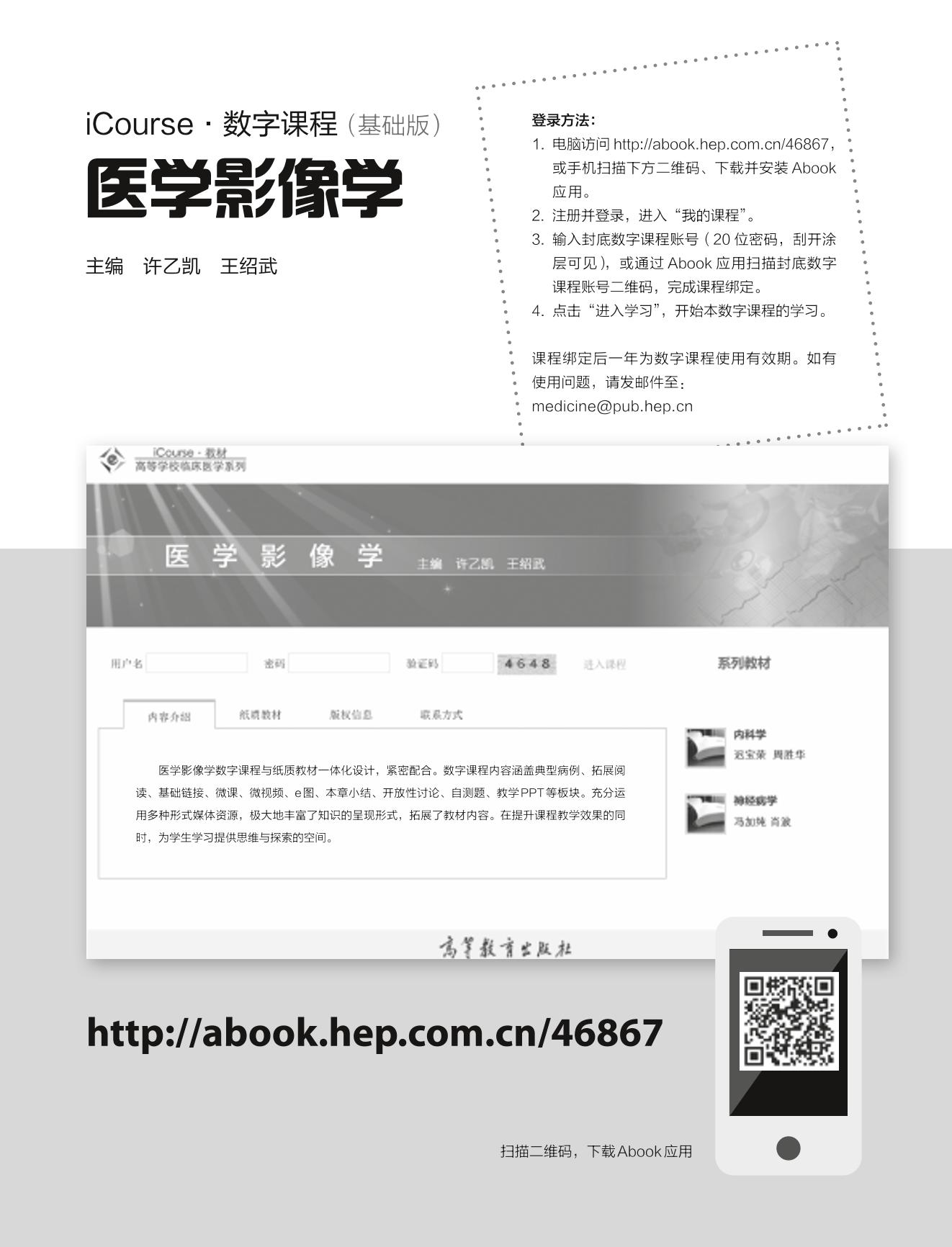 本书共两篇14 章。第一篇是医学影像诊断学,共9 章,包括总论和各论。总论主要介绍X 线、CT、超声和MRI 检查技术及其应用,以及影像学检查方法的综合应用与诊断原则;各论主要介绍各系统的检查技术及正常表现、基本病变影像表现和常见疾病影像诊断,包括神经系统、头颈部、呼吸系统、循环系统、消化系统与腹膜腔、泌尿生殖系统与腹膜后间隙、乳腺、骨骼肌肉系统,有关超声影像和儿科常见疾病诊断知识均穿插在各系统相应章节中阐述。第二篇是介入放射学,主要介绍介入放射学总论以及头颈部血管疾病的介入诊疗、外周血管疾病的介入诊疗、肿瘤的介入治疗以及其他非血管疾病的介入治疗。全书在保持内容系统性和完整性的基础上,力求简明、易读和实用。书中配有大量典型图片,力求图文并茂。全书采用纸质内容与数字化资源一体化设计,数字课程涵盖了典型病例、基础链接、拓展阅读、微课、微视频、本章小结、教学PPT 和自测题等,既方便教师教学,也有利于学生自主学习,提升教学效果和学习质量。 本书适用于高等学校临床、基础、预防、护理、检验、口腔、药学等专业,也是学生参加执业医师考试及住院医师规范化培训的必备书籍,还可供临床医务工作者和医学研究人员参考使用。 |