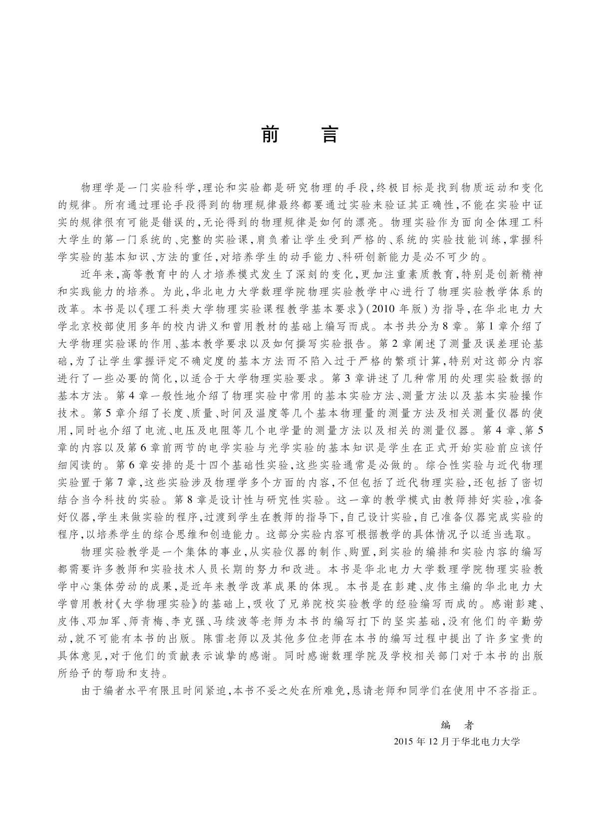 本书是以《理工科类大学物理实验课程教学基本要求》(2010年版)为指导,结合华北电力大学物理实验室建设的经验以及当前实验教学的实际编写而成的。全书共分8章,主要内容为绪论、测量及误差理论基础、实验数据处理的基本方法、物理实验方法和技术、基本物理量的测量及常用仪器的使用、基础性实验、综合性实验与近代物理实验、设计性与研究性实验。 本书可作为高等学校理工科非物理类专业大学物理实验课程的教学用书,也可作为科研及工程技术人员和其他有关人员的参考用书。 |