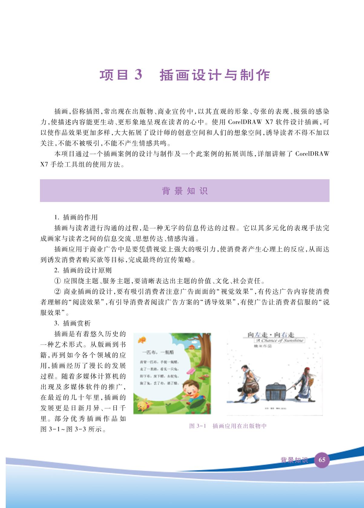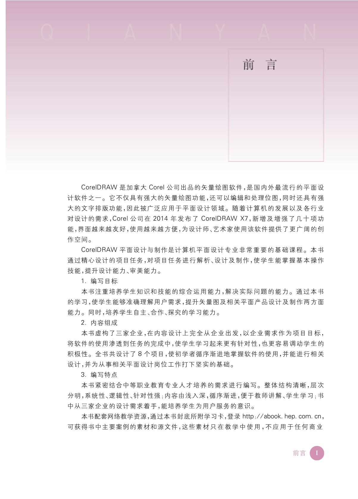 本书是计算机平面设计专业系列教材,依据教育部《中等职业学校计算机平面设计专业教学标准》进行编写。 本书在编写过程中直接导入项目和任务,通过实例介绍软件的功能及应用,既帮助读者掌握CorelDRAW X7的操作技巧、工具和命令的使用方法,又在教学内容的安排和教学过程的展开中,注重培养学习者的设计理念,使学习者在提高操作技能、艺术修养和设计水平的同时,加深对专业发展、行业需求的了解,帮助学习者迅速适应岗位需求。 本书虚构了启航计算机培训学校、方达房地产公司、小丑火锅店三家实体单位,以帮助企业做周边设计、广告宣传的案例作为主线,贯穿全书的教学。本书主要内容包括:VI设计与制作,特效文字制作,插画设计与制作,海报、展板设计与制作,宣传单、折页设计与制作,书籍装帧设计与制作,包装设计与制作,综合类广告设计与制作。 本书配套网络教学资源,使用本书封底所附的学习卡,登录http://abook.hep.com.cn,可获得书中主要案例的素材、源文件及其他教学资源。 本书适合作为计算机平面设计课程的教材,也可供各类电脑美术培训班作为教材使用,还可供电脑美术爱好者参考。 |