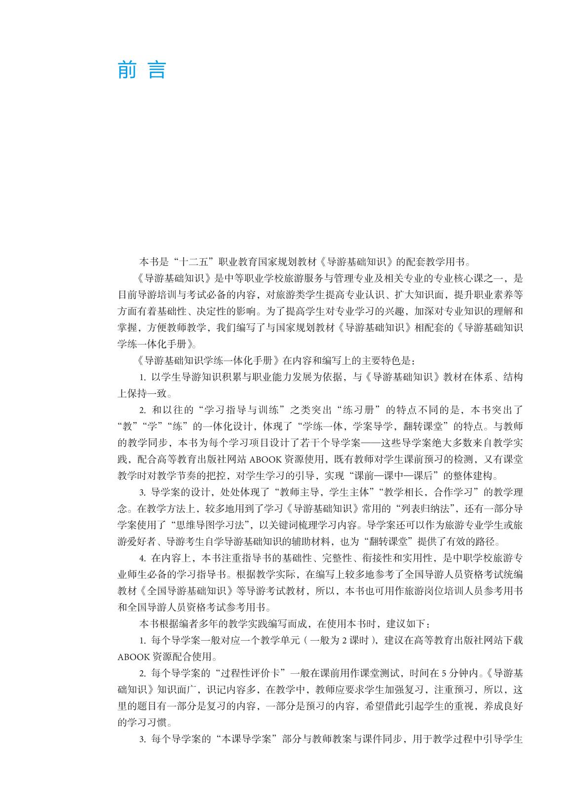 本书是“十二五”职业教育国家规划教材《导游基础知识》的配套教学用书,与主教材在体系、结构上保持一致,与电子教案、电子课件保持同步。和以往的“学习指导与训练”不同的是,本书突出了“教”“学”“练”的一体化设计,体现了“学练一体,学案导学,翻转课堂”的特点。 本书主要内容包括:领悟中国历史、走遍万水千山、体验民族风情、探秘宗教文化、寻访古代建筑、鉴赏古典园林、品味天下美食、博览风物特产、品读旅游诗文。每个项目包含若干个同步导学案。 为了满足师生对教学内容进行多角度、多形式练习的需要,本书为每个项目编写了“项目检测题”,配有三套“综合自测题”及答案,练习题型包括填空题、单项选择题、多项选择题、判断题、综合题等,便于学生自测和教学参考。请登录http://abook.hep.com.cn/sve 下载主要参考答案。 本书是中职学校旅游专业师生必备的学习指导书,也可用作旅游岗位培训人员参考用书和全国导游人员资格考试参考用书。 本书配有中国大学MOOC/职教课程——"导游实务 ",请登录以下网址查看详情:http://www.icourse163.org/course/HEPSVE-479002 |