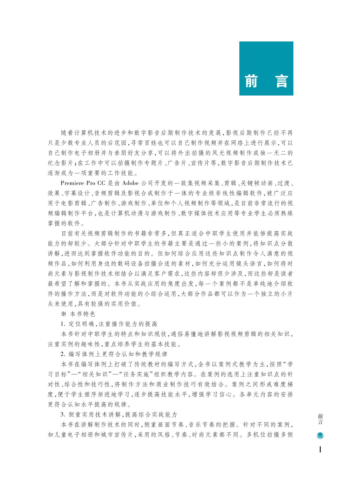 本书是数字技术媒体应用专业系列教材,是教育部职业教育与成人教育司校企合作项目——“数字媒体技能教学示范项目试点”指定教材? 本书分为基础篇和综合篇,共11 个单元?在“基础篇”中,首先介绍视频剪辑的相关知识和Premiere Pro CC 的基本操作方法,并通过一个案例让读者初步了解视频剪辑的操作流程;然后从DV 视频拍摄?素材导入?视频剪辑?关键帧动画?视频过渡?视频效果?字幕设计?音频剪辑和输出等几个方面详细讲解Premiere Pro CC 的实现方法及制作技巧?在“综合篇”中,分别从儿童电子相册?多机位拍摄及剪辑?城市宣传片等应用领域,对Premiere Pro CC 的视频剪辑技术进行综合应用的讲解,进一步提高实战技能? 本书配套网络教学资源,通过封底所附学习卡,登录网站http:/ /abook.hep.com.cn/ sve,可获取相关教学资源,详见书末“郑重声明”页? 本书侧重数字影音后期制作基本技能的培养,同时突出实战能力的提高?本书适合作为中等职业学校计算机应用?数字媒体技术应用?计算机动漫与游戏制作?计算机平面设计等专业的教材,也可作为影视后期制作爱好者的参考用书? |