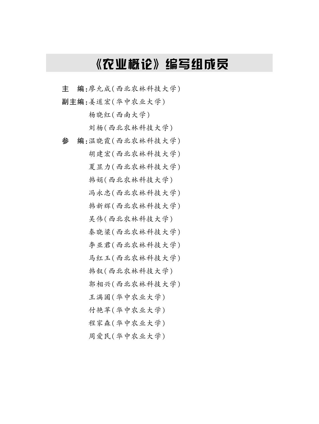 前辅文 第一章 绪论 第一节 农业与农业生产 第二节 农业的发展历程 第三节 中国农业技术发展的现状与方向 第二章 农业的起源与发展 第一节 农业的起源 第二节 中国农业发展简史 第三节 世界农业发展简史 第三章 农业资源与区划 第一节 农业资源 第二节 农业资源的开发与利用 第三节 农业资源区划 第四章 农业生态系统 第一节 农业生态系统的结构 第二节 农业生态系统中的养分循环与平衡 第五章 农业生产经营 第一节 农业生产经营概述 第二节 农业生产经营体制 第三节 农业生产过程及农业生产经营组织 第四节 农业生产安全质量管理 第五节 农产品流通 第六节 农产品营销 第六章 现代农业科技 第一节 现代农业概况 第二节 现代农业的发展历程 第三节 中国农业科技发展的战略需求 第四节 现代农业的发展趋势与展望 第七章 世界农业 第一节 美国、法国、德国农业的特点 第二节 加拿大、澳大利亚、巴西农业的特点 第三节 日本、以色列、印度农业的特点 第八章 作物学概述 第一节 作物与生态环境的关系 第二节 作物品种改良 第三节 作物生产技术 第四节 农作制度 第九章 园艺学概述 第一节 园艺植物的分类 第二节 园艺植物繁殖和栽植技术 第十章 畜牧学概述 第一节 我国畜牧业的现状 第二节 动物营养与饲料 第三节 动物遗传繁育 第十一章 植物保护学概述 第一节 植物保护的作用 第二节 植物保护的方式