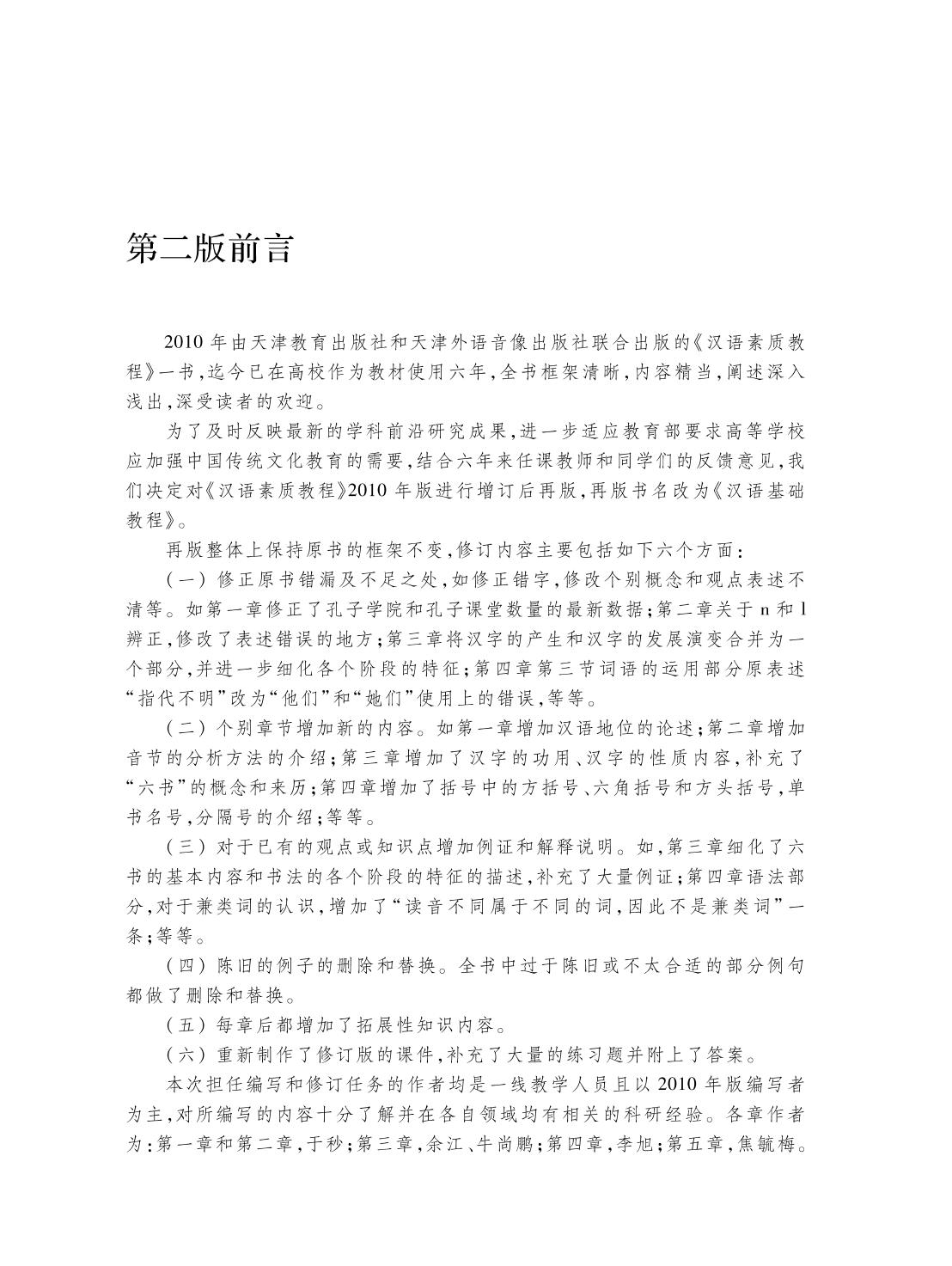 《汉语基础教程》分为五章。第一章主要介绍普通话定义、普通话与方言、推广普通话的意义和普通话水平考试等级与考试等方面的知识;第二章介绍普通话语音的基础知识;第三章介绍了汉字的性质、汉字的历史、汉字的结构、“六书”和汉字字形等方面的基础知识;第四章介绍汉语语法的基本知识和标点符号的用法;第五章则系统介绍了修辞学中的一些基本概念以及重要观点。 本书不仅介绍了语音、文字、语法和修辞等知识,在各章后还附有拓展阅读资源供读者进一步学习,同时针对各章节编写了大量的练习题并提供参考答案供读者复习和思考。本书框架清晰,内容精当,阐述深入浅出,适用于希望提高母语综合素质的非中文专业的本科生,也可作为来华留学生系统学习汉语基础知识的参考书。 |