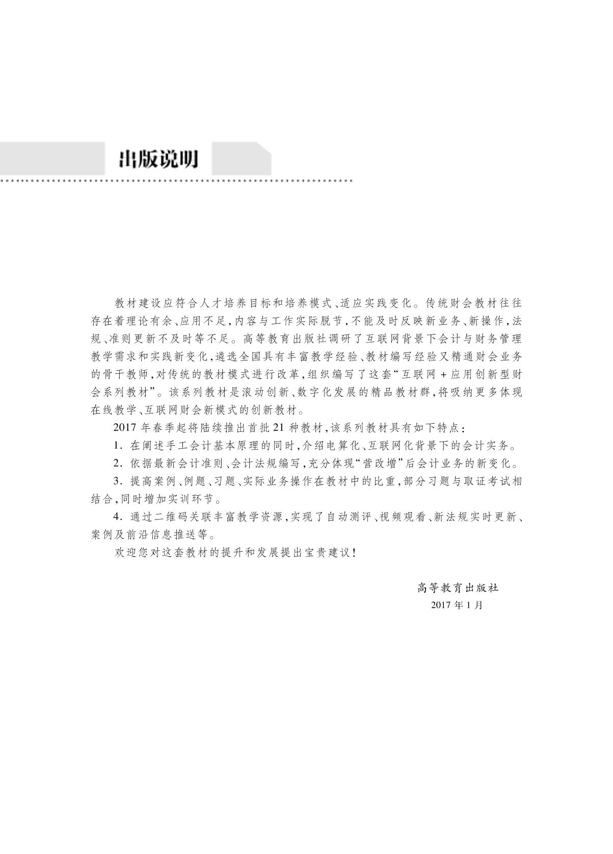本教材以最新COSO理论为基础,紧密结合内部控制与风险管理,以学生“翻转课堂”的部分成果为案例支撑,并在教材各章中采用学习目标、本章知识结构图、引例、本章小结、关键名词、即测即评、思考题及延伸阅读等栏目,以期突出教材 “教”与“学”的两环节与视角,更好地提高教学效果。本教材根据内部控制领域的最新进展,结合国内和国外的典型案例,构建基于风险管理整体框架的内部控制教学内容体系。 全书共计10章和6个典型案例,除第一章绪论外,分别论述了基于最新COSO风险管理框架(ERM )的内部控制基本理论、全面风险管理、控制环境、风险评估、控制活动、信息与沟通、监控与报告、传统业务循环的内部控制设计以及其他业务循环的内部控制设计等内容,并通过6个典型综合案例,对于内部控制理论与方法进行了进一步剖析与讲解。 本书可作为普通高等教育会计学、财务管理专业以及经济管理类相关专业教学的课程教材,也可作为企事业单位内部控制培训用书。 |