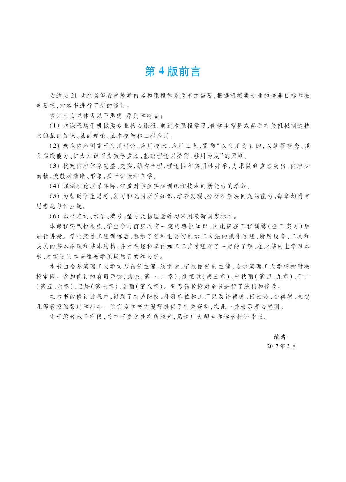 本书内容包括:金属切削加工基础知识、常用切削加工方法、典型表面加工、机床夹具、机械加工工艺规程设计、机械加工误差、机器装配工艺、结构工艺性、特种加工与数控加工等。各章附有思考题与作业题。