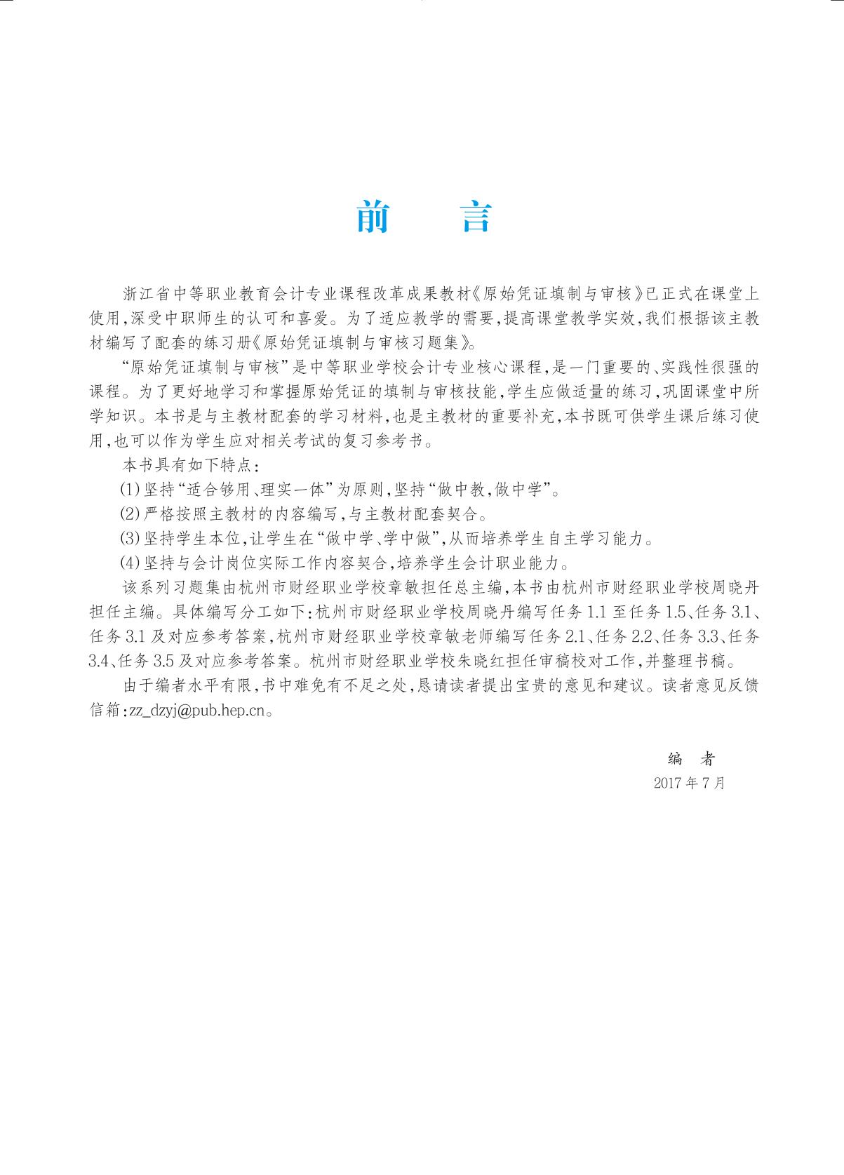 本书是浙江省中等职业教育会计专业课程改革成果教材《原始凭证填制与审核》(ISBN 978-7-04-041213-0)的配套习题集。