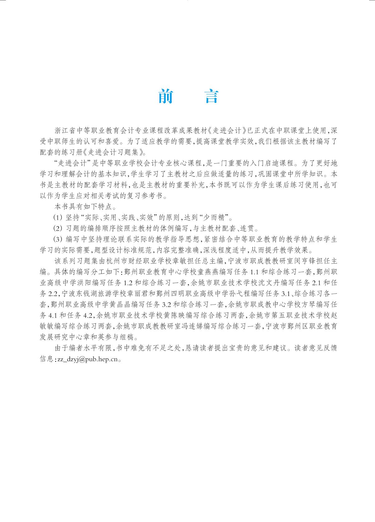 本书是浙江省中等职业教育会计专业课程改革成果教材《走进会计》(ISBN 978-7-04-040657-3)的配套习题集。