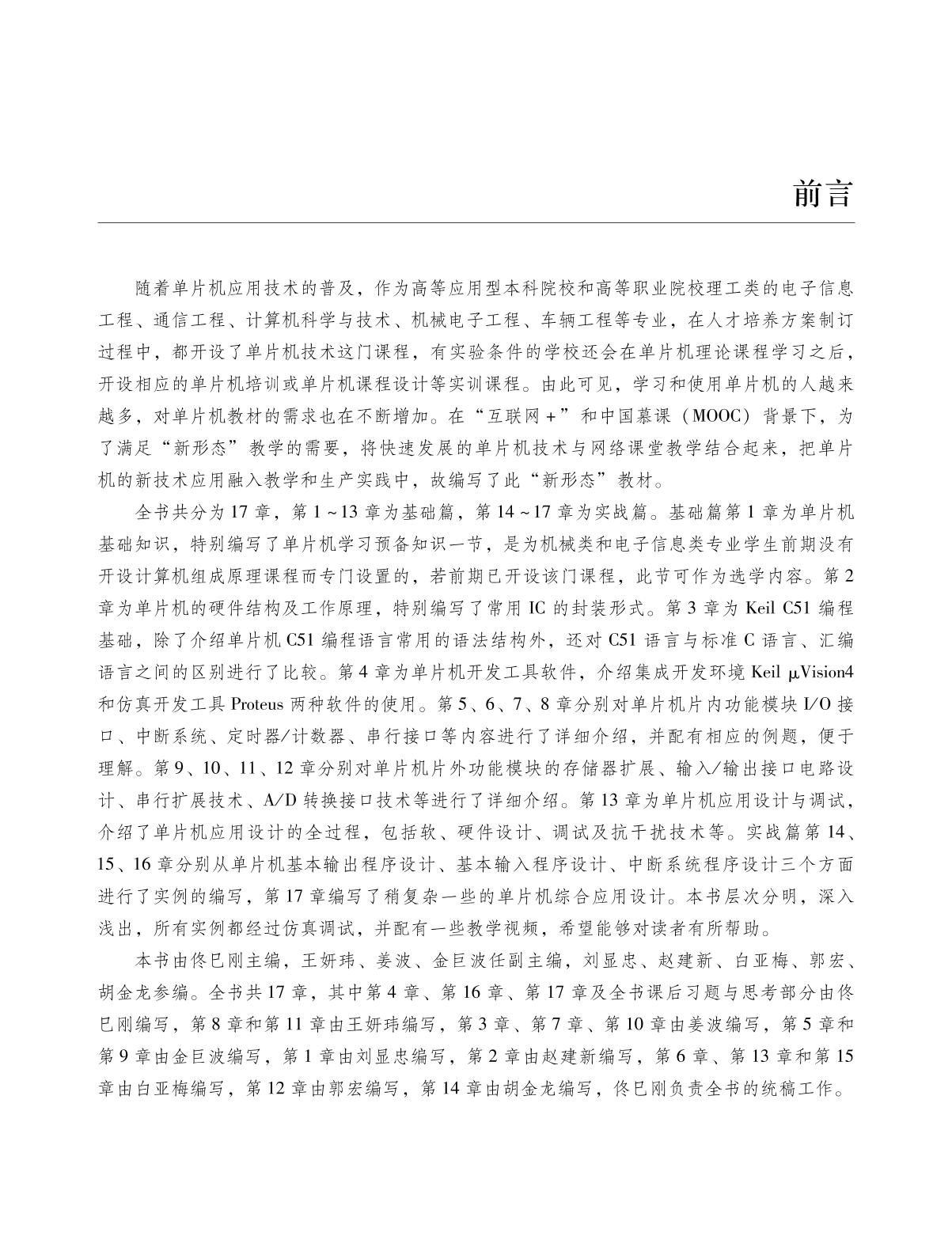 本书分为基础篇和实战篇两大部分,基础篇以AT89S51单片机为例介绍了单片机的工作原理、片内功能模块工作原理、片外接口技术、Keil C51编程、Keil开发工具软件使用、Proteus仿真工具软件使用以及单片机开发技术等内容;实战篇编写了大量的单片机实例,以适用读者在理论课学习的基础上进行单片机培训或单片机课程设计等实践类课程的需求。本教材的核心内容已录制成微视频并配套有PPT,读者可通过扫描二维码观看到相关知识点的参考视频和PPT,方便读者自学。 本书可作为高等工科院校电气类、电子信息类、计算机类、机械类等专业的教材,也可作为从事单片机应用系统设计、生产技术人员的参考书。 |